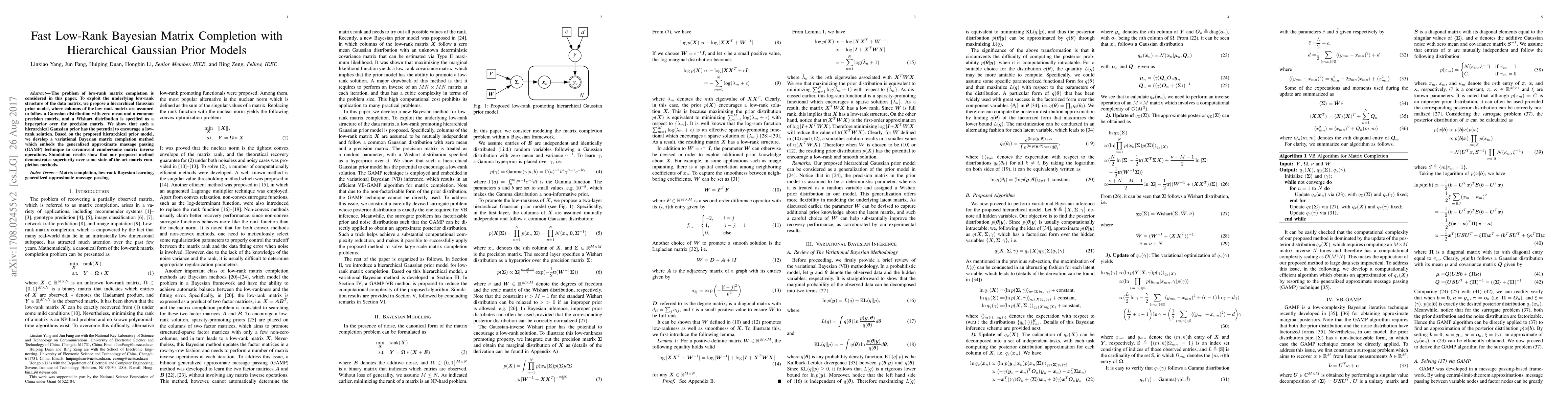 This paper proposes a hierarchical Gaussian prior model for low-rank matrix completion, embedding the GAMP technique within a variational Bayesian framework to efficiently infer the low-rank structure. Simulation results show the method outperforms existing state-of-the-art techniques.