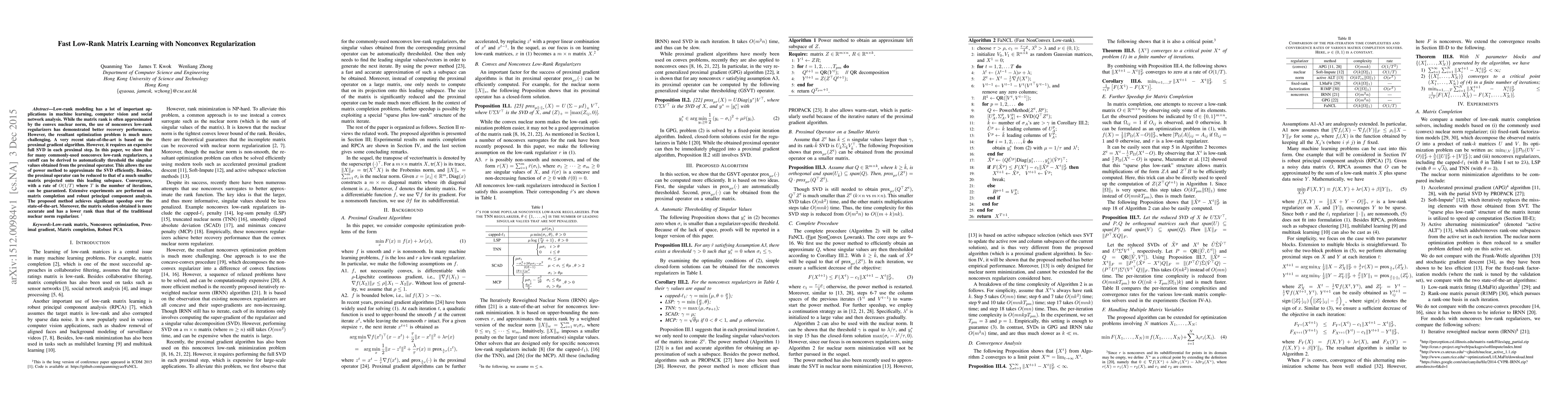 This paper proposes an efficient algorithm for fast low-rank matrix learning using nonconvex regularization, achieving significant speedup by leveraging a cutoff threshold and power method approximation. The method outperforms traditional nuclear norm regularization in terms of both accuracy and computational efficiency.