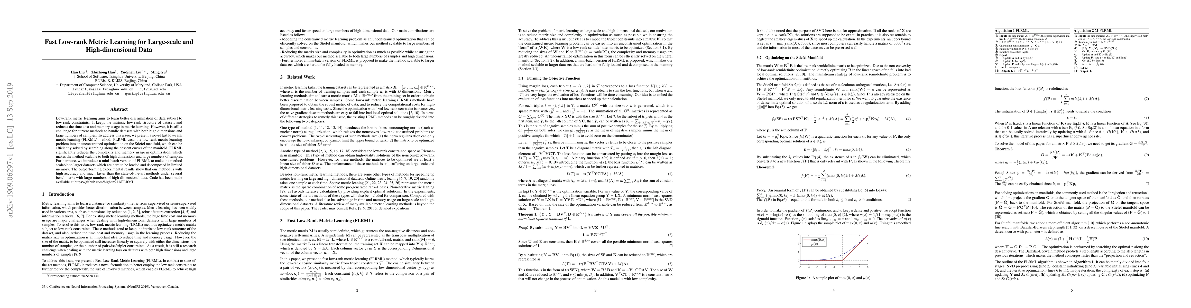 This paper introduces a fast low-rank metric learning (FLRML) method to efficiently handle large-scale and high-dimensional datasets. FLRML optimizes on the Stiefel manifold, reducing complexity and memory usage, and includes a mini-batch version for scalability. Experimental results demonstrate superior accuracy and speed compared to state-of-the-art methods.