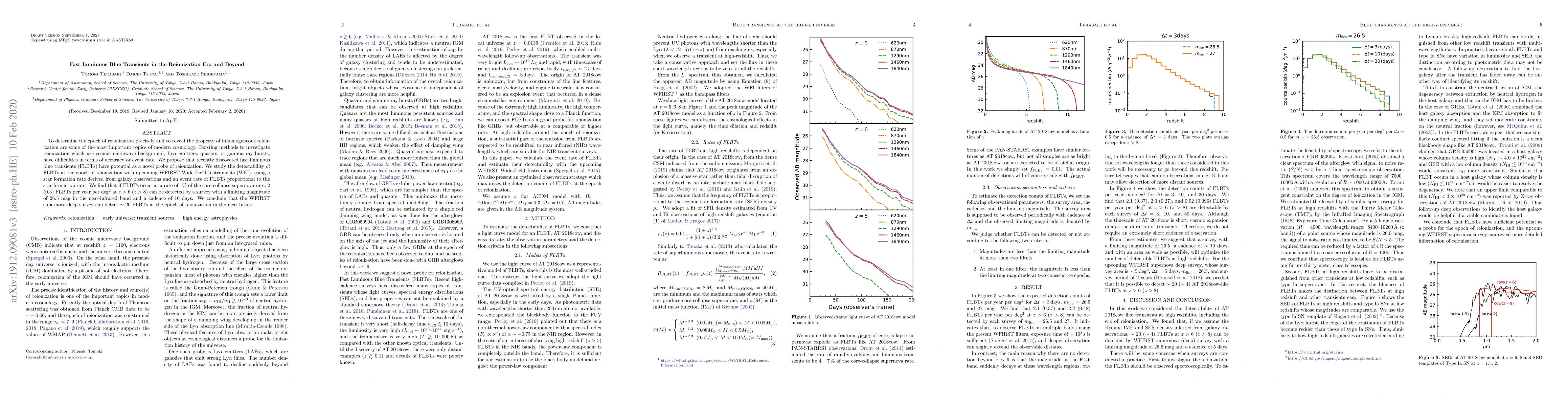 This research proposes using Fast Luminous Blue Transients (FLBTs) as a new probe for the epoch of reionization in cosmology. With upcoming WFIRST Wide-Field Instruments, the study suggests that a survey with specified magnitude and cadence could detect approximately 20 FLBTs at reionization epoch, assuming an event rate of 1% of core-collapse supernovae.