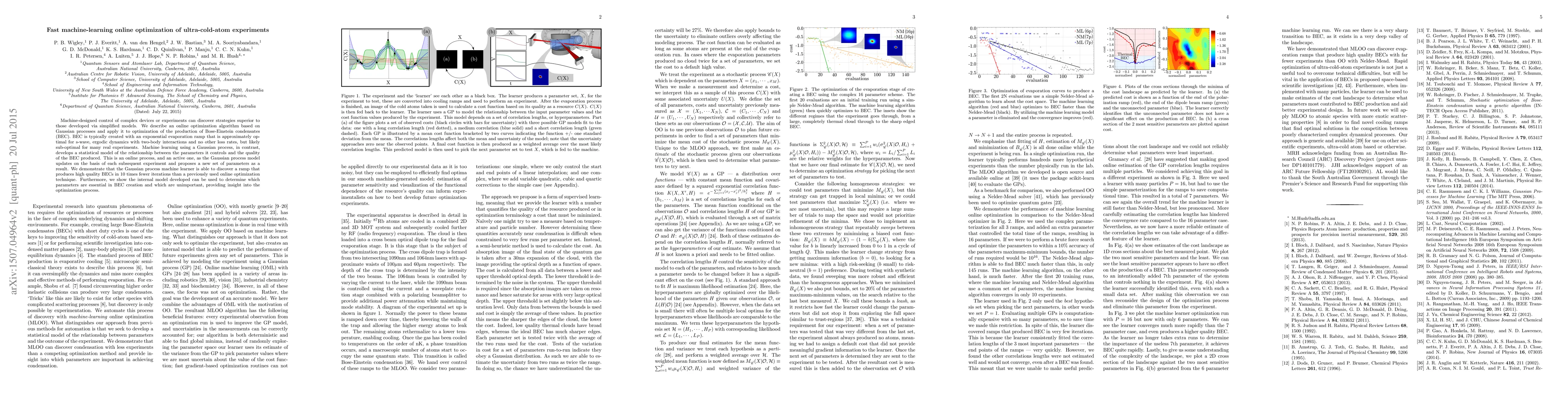 Machine-designed control of complex devices or experiments can discover strategies superior to those developed via simplified models. We describe an online optimization algorithm based on Gaussian processes and apply it to optimization of the production of Bose-Einstein condensates (BEC). BEC is typically created with an exponential evaporation ramp that is approximately optimal for s-wave, ergodic dynamics with two-body interactions and no other loss rates, but likely sub-optimal for many real experiments. Machine learning using a Gaussian process, in contrast, develops a statistical model of the relationship between the parameters it controls and the quality of the BEC produced. This is an online process, and an active one, as the Gaussian process model updates on the basis of each subsequent experiment and proposes a new set of parameters as a result. We demonstrate that the Gaussian process machine learner is able to discover a ramp that produces high quality BECs in 10 times fewer iterations than a previously used online optimization technique. Furthermore, we show the internal model developed can be used to determine which parameters are essential in BEC creation and which are unimportant, providing insight into the optimization process.