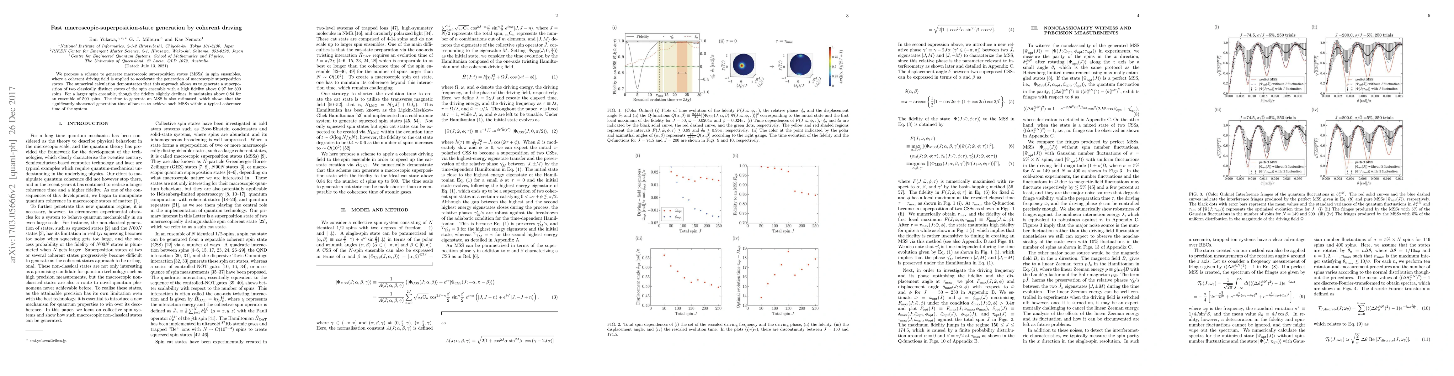 This paper proposes a method for rapidly generating macroscopic superposition states in spin ensembles using a coherent driving field, achieving high fidelity (above 0.96) for 300 spins and maintaining fidelity above 0.85 for 500 spins, while significantly reducing the generation time within typical coherence periods.