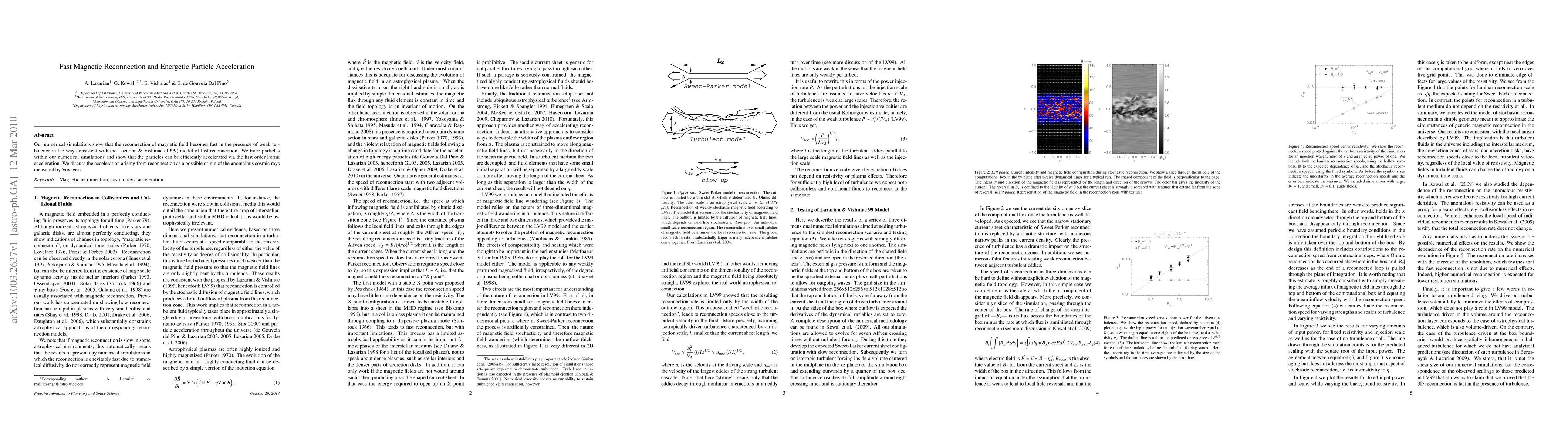 Our numerical simulations show that the reconnection of magnetic field becomes fast in the presence of weak turbulence in the way consistent with the Lazarian and Vishniac (1999) model of fast reconnection. We trace particles within our numerical simulations and show that the particles can be efficiently accelerated via the first order Fermi acceleration. We discuss the acceleration arising from reconnection as a possible origin of the anomalous cosmic rays measured by Voyagers.