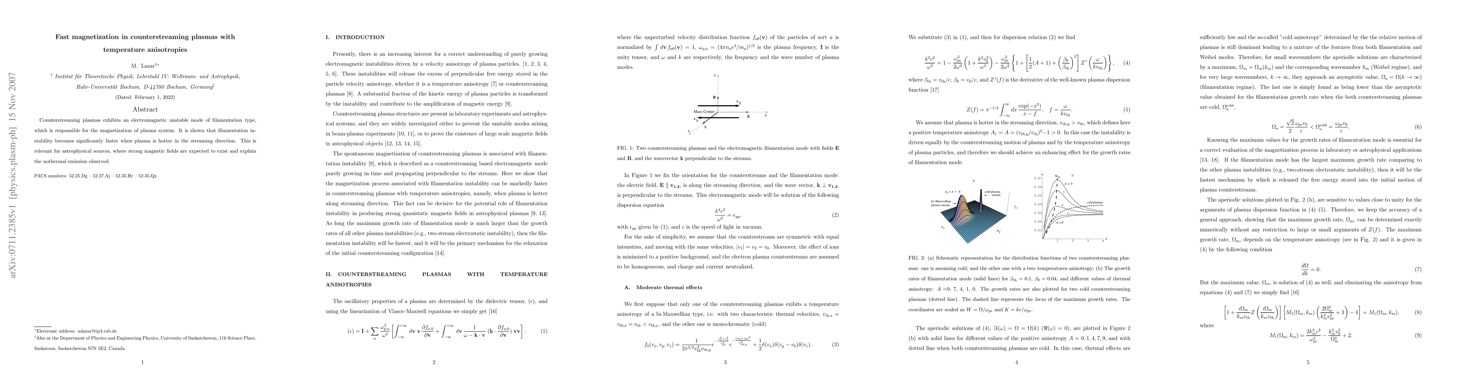 Counterstreaming plasmas exhibits an electromagnetic unstable mode of filamentation type, which is responsible for the magnetization of plasma system. It is shown that filamentation instability becomes significantly faster when plasma is hotter in the streaming direction. This is relevant for astrophysical sources, where strong magnetic fields are expected to exist and explain the nothermal emission observed.