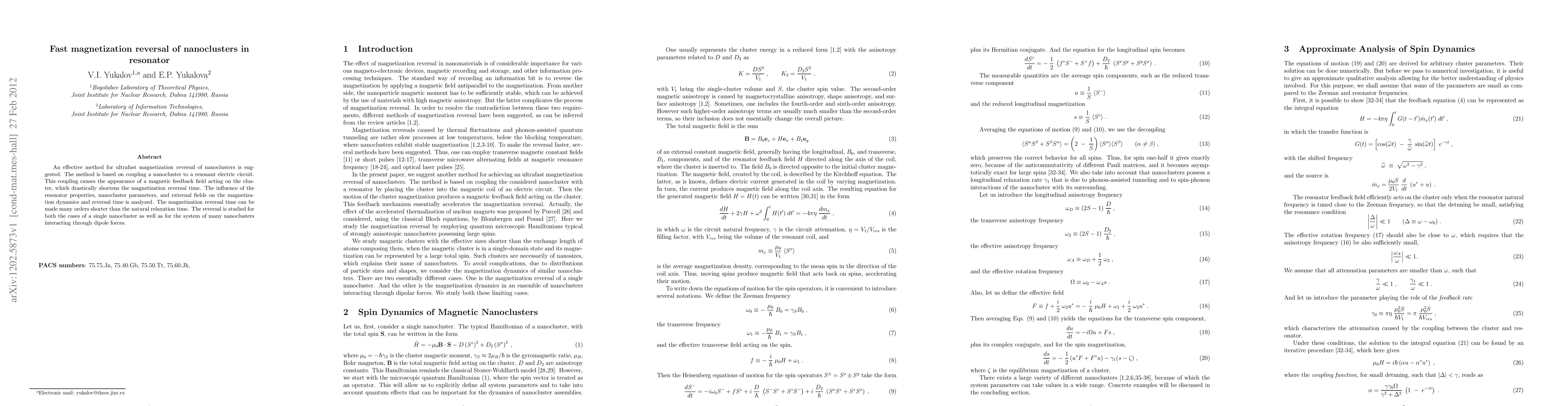 This paper proposes a method for ultrafast magnetization reversal in nanoclusters by coupling them to a resonant electric circuit, which generates a magnetic feedback field that significantly reduces reversal time. The study analyzes the effects of resonator properties, nanocluster parameters, and external fields on magnetization dynamics, demonstrating that reversal times can be orders of magnitude shorter than natural relaxation times, both for single nanoclusters and systems of interacting nanoclusters.
