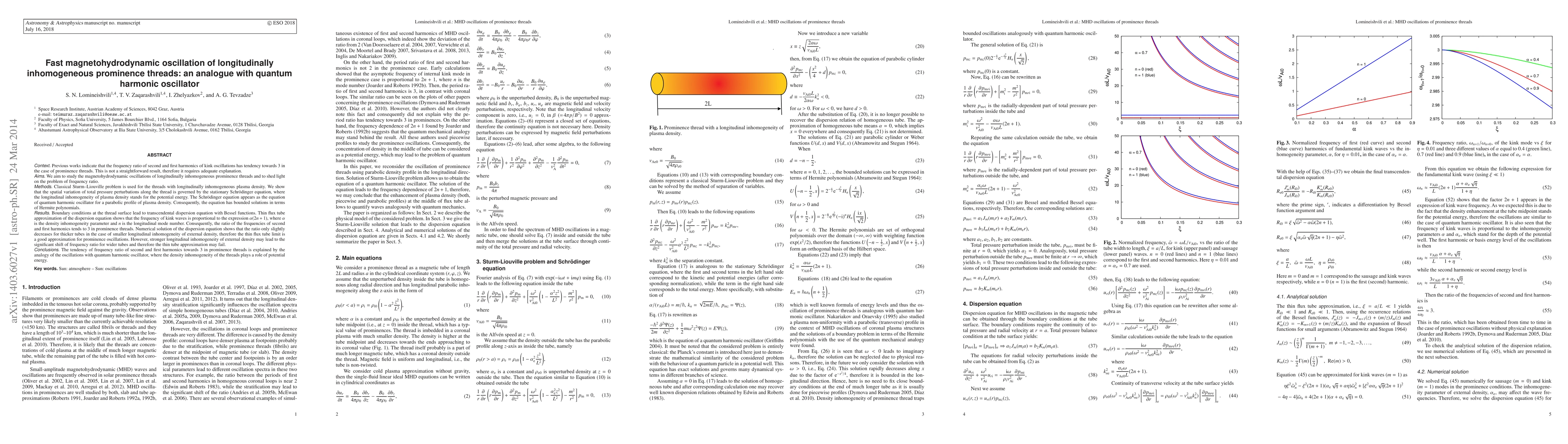 This paper investigates magnetohydrodynamic oscillations in longitudinally inhomogeneous prominence threads, demonstrating that their frequency ratio of second and first harmonics tends towards 3. It uses the Sturm-Liouville problem and Schrödinger equation to show that the oscillations resemble quantum harmonic oscillators, where plasma density inhomogeneity acts as potential energy.