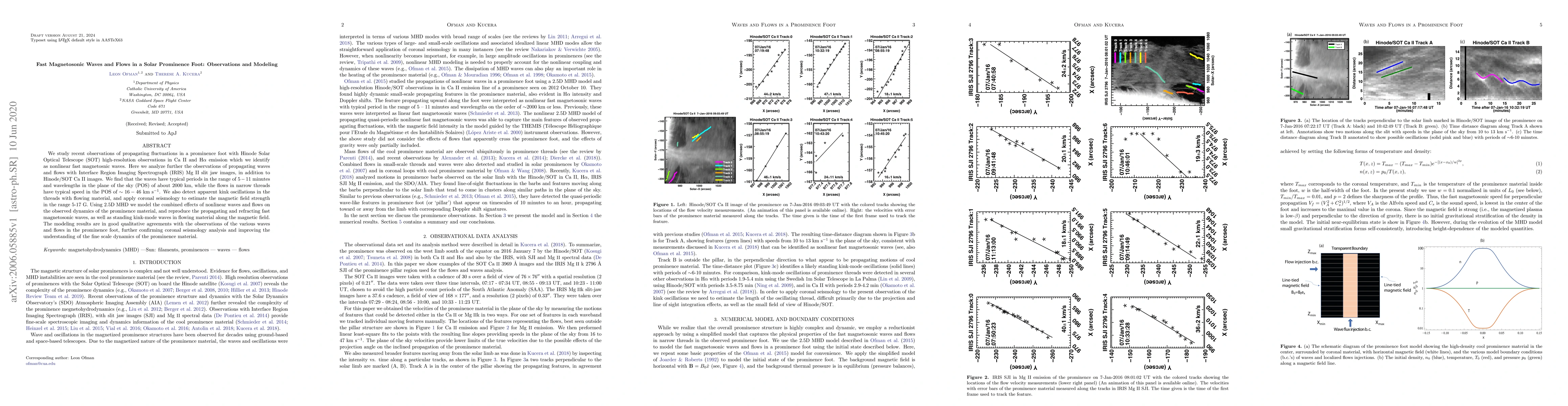 This paper investigates nonlinear fast magnetosonic waves and flows in a solar prominence foot using observations from Hinode/SOT and IRIS, identifying waves with periods of 5-11 minutes and flows with speeds of ~16-46 km/s. The study employs 2.5D MHD modeling to replicate the observed dynamics, confirming coronal seismology and enhancing comprehension of the prominence's fine-scale behavior.