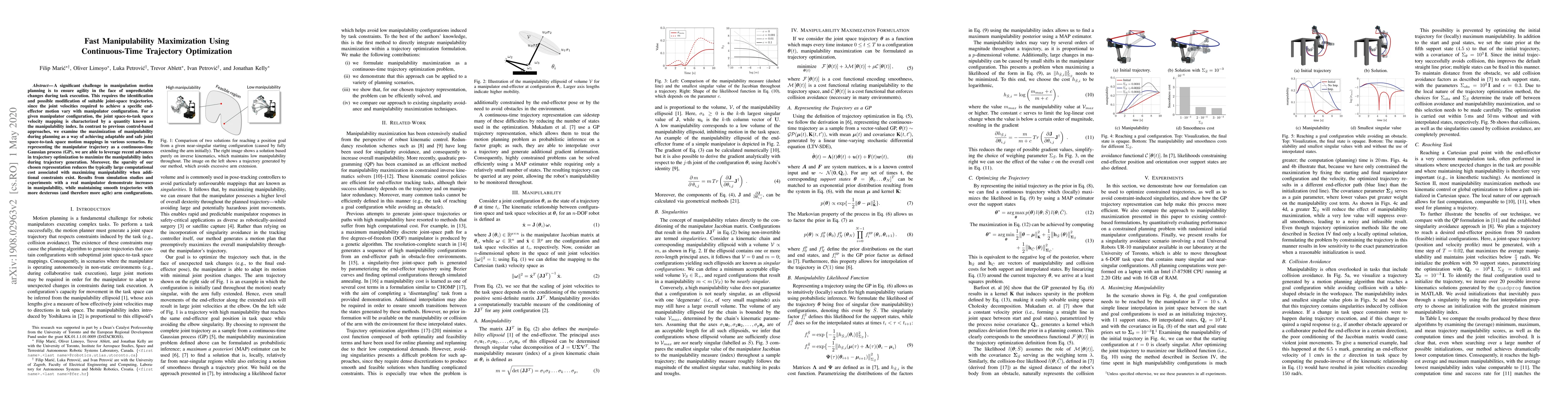 This paper proposes a method for fast manipulability maximization during manipulation motion planning using continuous-time trajectory optimization. By leveraging a Gaussian process representation, the approach efficiently maximizes the manipulability index, resulting in more agile and adaptable manipulator configurations while maintaining smooth trajectories.