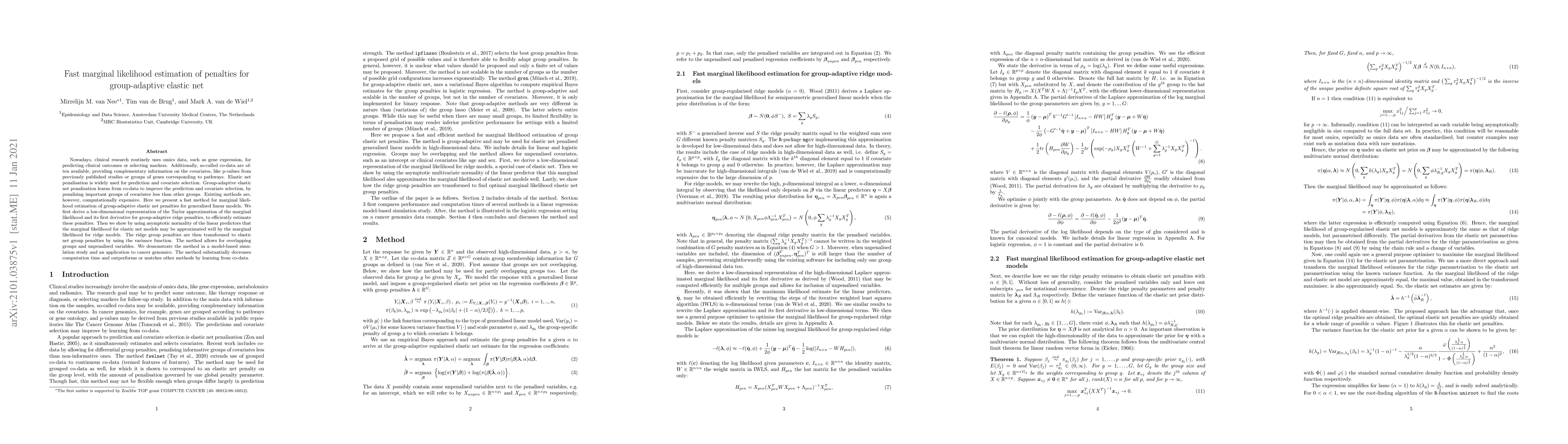 This paper introduces a fast method for estimating the marginal likelihood of group-adaptive elastic net penalties in generalized linear models, significantly reducing computational costs. It leverages a low-dimensional Taylor approximation for efficient estimation of ridge penalties, which are then transformed into elastic net penalties, allowing for overlapping groups and unpenalised variables.