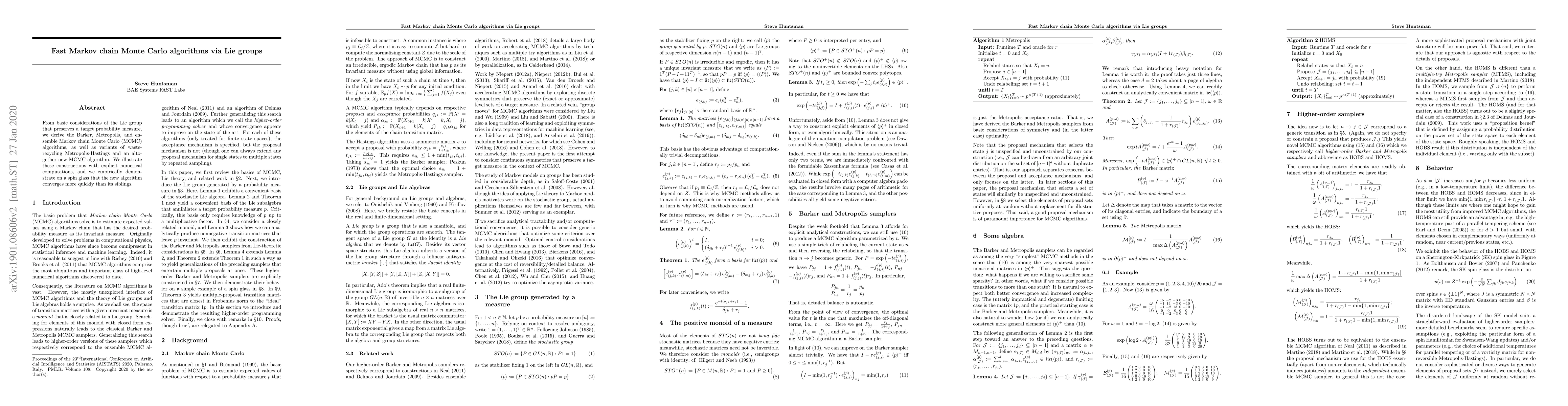 This paper proposes novel Markov Chain Monte Carlo (MCMC) algorithms based on Lie group theory, including Barker, Metropolis, ensemble, and a new algorithm. Empirical results show the new algorithm converges faster for a spin glass model.
