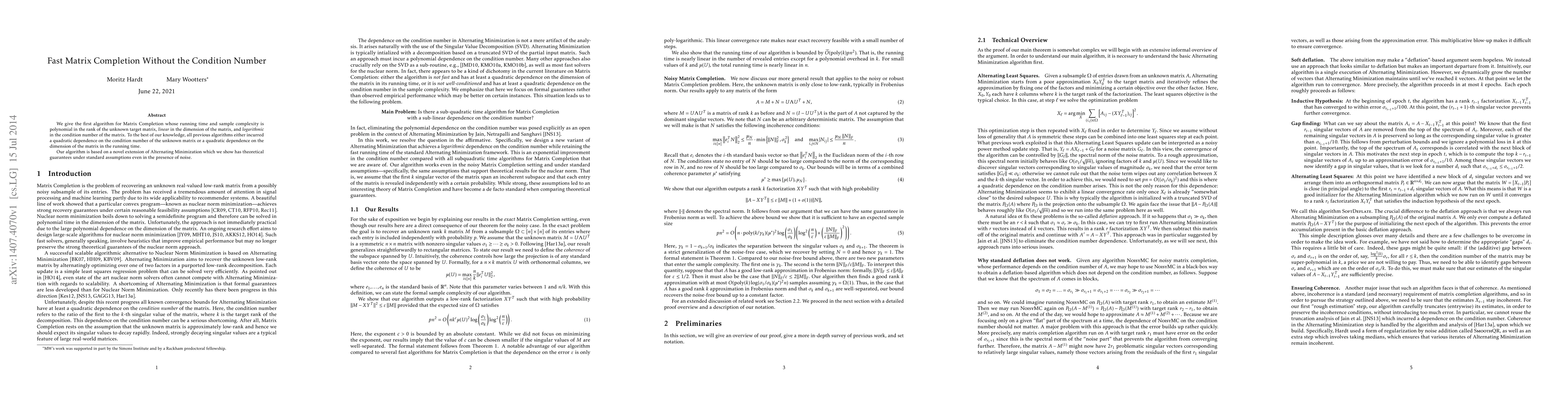 We give the first algorithm for Matrix Completion whose running time and sample complexity is polynomial in the rank of the unknown target matrix, linear in the dimension of the matrix, and logarithmic in the condition number of the matrix. To the best of our knowledge, all previous algorithms either incurred a quadratic dependence on the condition number of the unknown matrix or a quadratic dependence on the dimension of the matrix in the running time. Our algorithm is based on a novel extension of Alternating Minimization which we show has theoretical guarantees under standard assumptions even in the presence of noise.