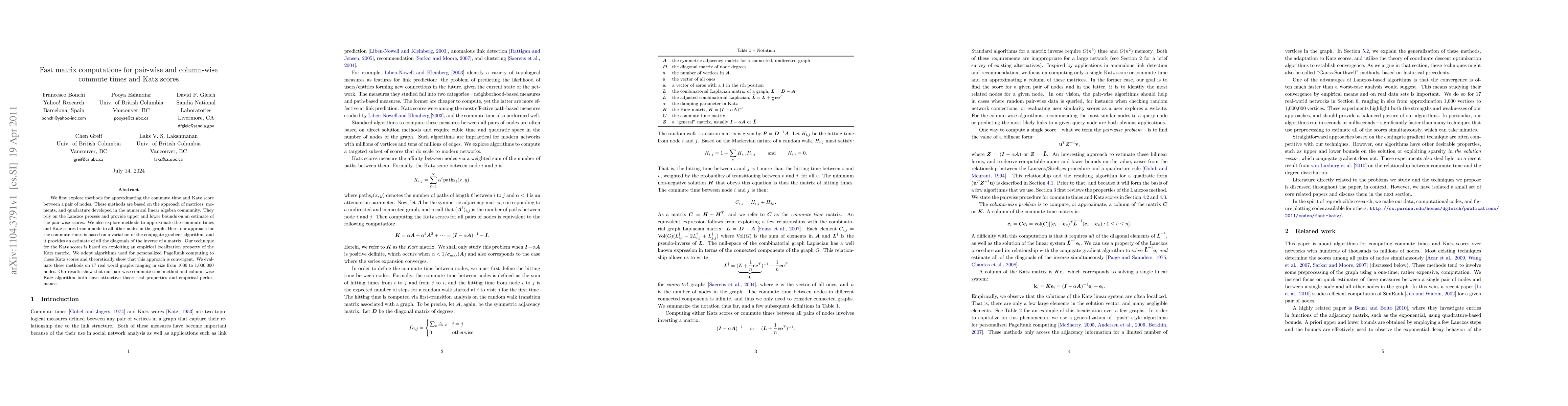 We first explore methods for approximating the commute time and Katz score between a pair of nodes. These methods are based on the approach of matrices, moments, and quadrature developed in the numerical linear algebra community. They rely on the Lanczos process and provide upper and lower bounds on an estimate of the pair-wise scores. We also explore methods to approximate the commute times and Katz scores from a node to all other nodes in the graph. Here, our approach for the commute times is based on a variation of the conjugate gradient algorithm, and it provides an estimate of all the diagonals of the inverse of a matrix. Our technique for the Katz scores is based on exploiting an empirical localization property of the Katz matrix. We adopt algorithms used for personalized PageRank computing to these Katz scores and theoretically show that this approach is convergent. We evaluate these methods on 17 real world graphs ranging in size from 1000 to 1,000,000 nodes. Our results show that our pair-wise commute time method and column-wise Katz algorithm both have attractive theoretical properties and empirical performance.