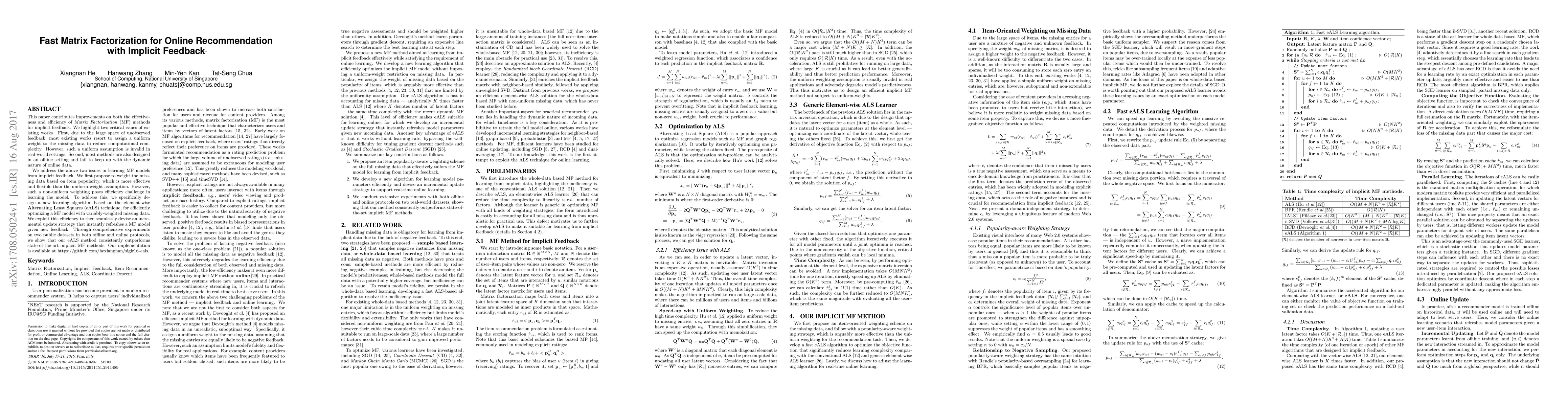 This paper proposes an efficient Matrix Factorization method for online recommendation systems using implicit feedback, addressing the issues of uniform weighting and offline design. It introduces a non-uniform weighting based on item popularity and an element-wise Alternating Least Squares algorithm for fast optimization, achieving better performance and real-time updates.