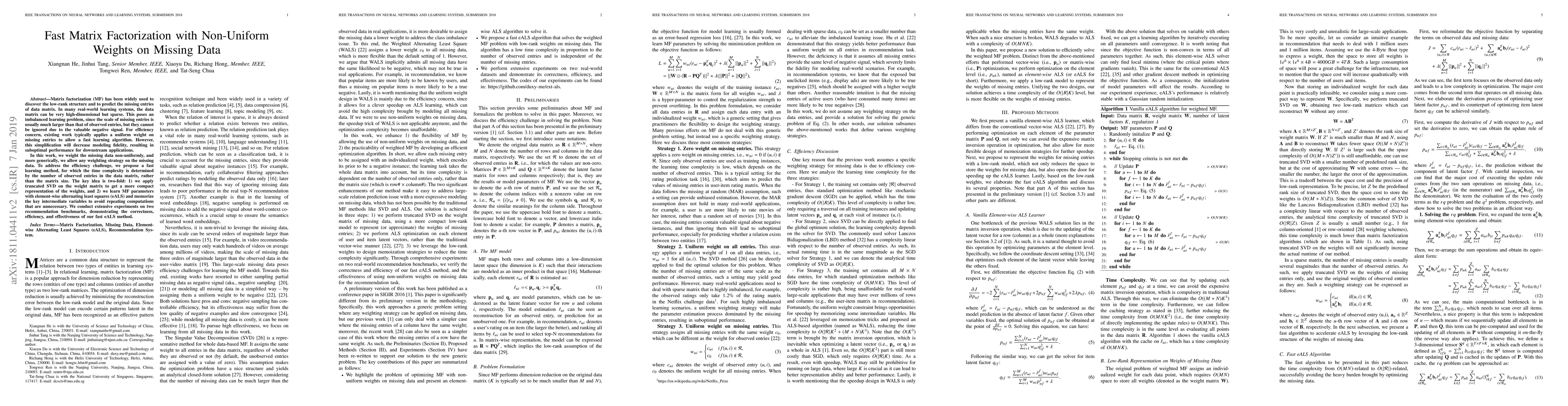 This paper proposes a method for fast matrix factorization with non-uniform weights on missing data, aiming to improve modeling fidelity over uniform weighting. The authors introduce a two-fold approach: truncated SVD for compact weight representation and element-wise alternating least squares with memorized intermediate variables to reduce computation time.