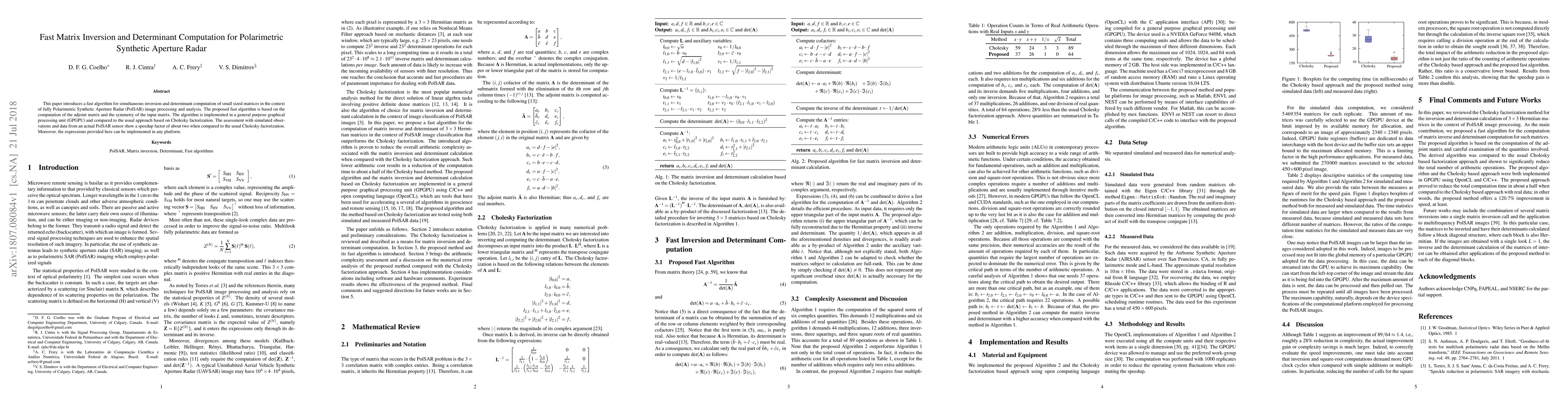 This paper presents a fast algorithm for simultaneous matrix inversion and determinant computation in Polarimetric Synthetic Aperture Radar (PolSAR) using the adjoint matrix and matrix symmetry, implemented on a GPGPU, achieving a speedup factor of about two compared to the Cholesky factorization method. The algorithm is versatile and can be implemented across various platforms.