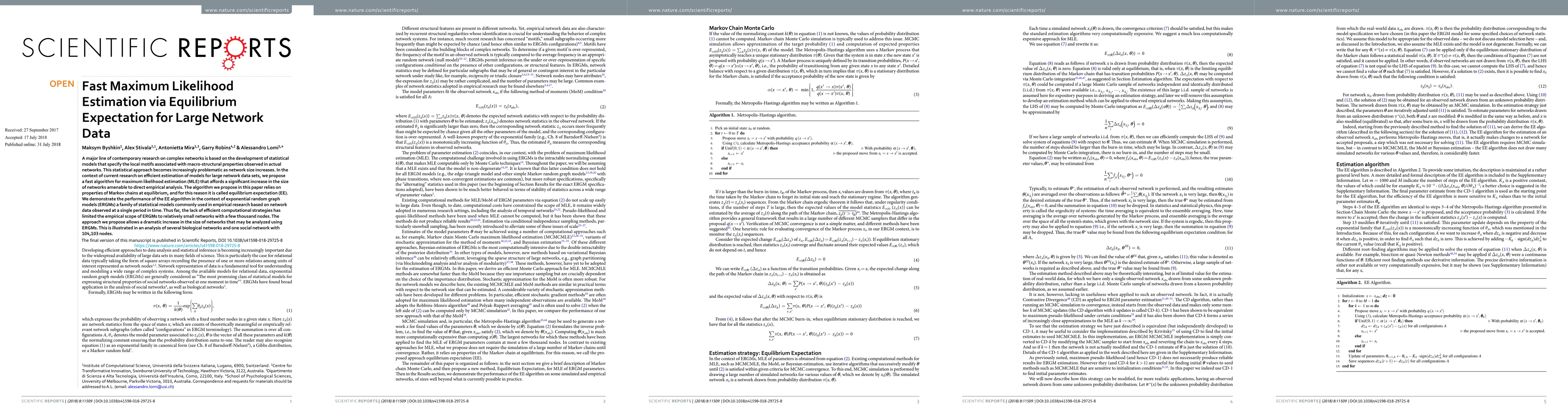 A major line of contemporary research on complex networks is based on the development of statistical models that specify the local motifs associated with macro-structural properties observed in actual networks. This statistical approach becomes increasingly problematic as network size increases. In the context of current research on efficient estimation of models for large network data sets, we propose a fast algorithm for maximum likelihood estimation (MLE) that afords a signifcant increase in the size of networks amenable to direct empirical analysis. The algorithm we propose in this paper relies on properties of Markov chains at equilibrium, and for this reason it is called equilibrium expectation (EE). We demonstrate the performance of the EE algorithm in the context of exponential random graphmodels (ERGMs) a family of statistical models commonly used in empirical research based on network data observed at a single period in time. Thus far, the lack of efcient computational strategies has limited the empirical scope of ERGMs to relatively small networks with a few thousand nodes. The approach we propose allows a dramatic increase in the size of networks that may be analyzed using ERGMs. This is illustrated in an analysis of several biological networks and one social network with 104,103 nodes