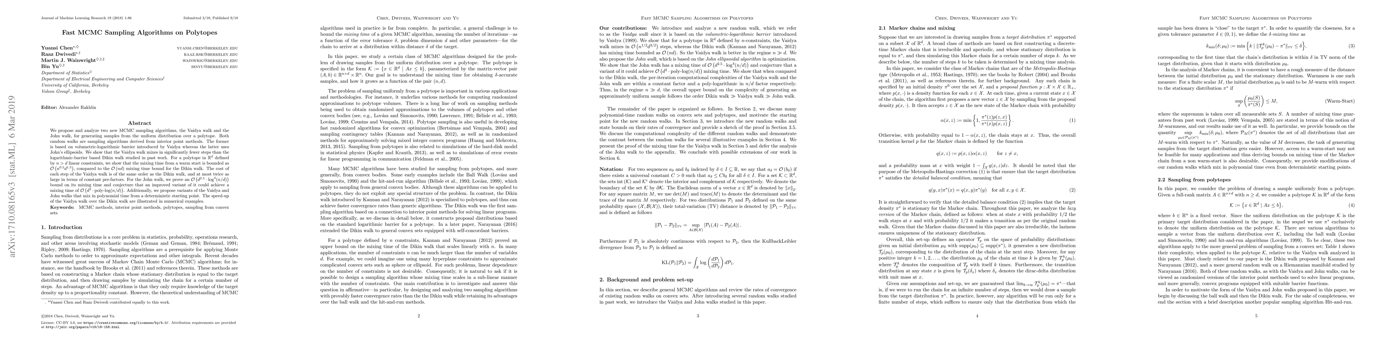 This paper introduces two new MCMC sampling algorithms, the Vaidya walk and the John walk, for generating uniform samples over polytopes. The Vaidya walk outperforms the Dikin walk with a significantly reduced mixing time of $\mathcal{O}(n^{0.5}d^{1.5})$ compared to $\mathcal{O}(nd)$. The John walk has a mixing time of $\mathcal{O}(d^{2.5}\cdot\log^4(n/d))$, with a conjectured improved variant achieving $\mathcal{O}(d^2\cdot\text{polylog}(n/d))$.