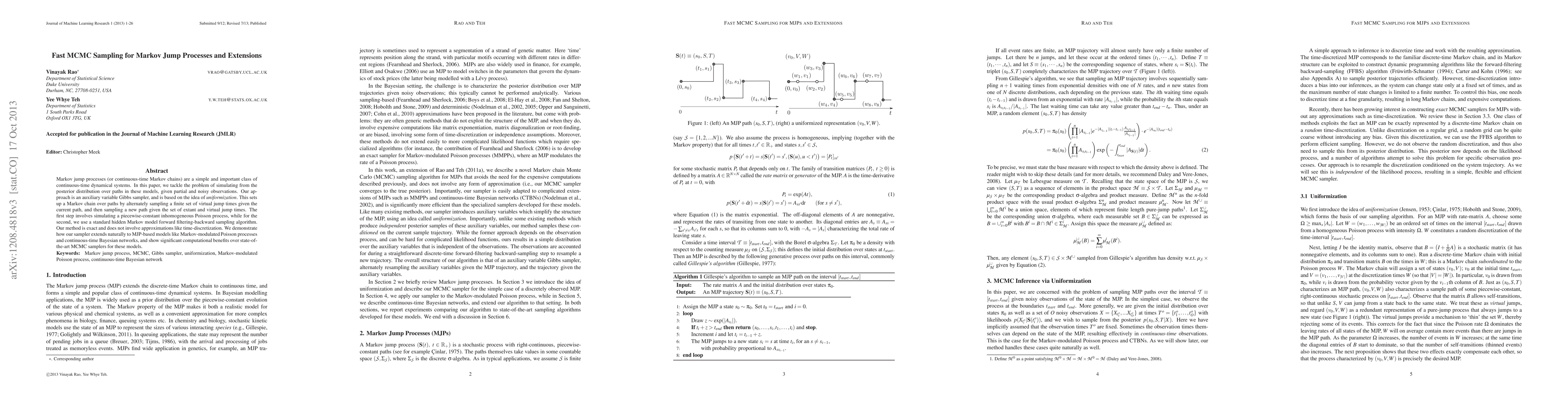 Markov jump processes (or continuous-time Markov chains) are a simple and important class of continuous-time dynamical systems. In this paper, we tackle the problem of simulating from the posterior distribution over paths in these models, given partial and noisy observations. Our approach is an auxiliary variable Gibbs sampler, and is based on the idea of uniformization. This sets up a Markov chain over paths by alternately sampling a finite set of virtual jump times given the current path and then sampling a new path given the set of extant and virtual jump times using a standard hidden Markov model forward filtering-backward sampling algorithm. Our method is exact and does not involve approximations like time-discretization. We demonstrate how our sampler extends naturally to MJP-based models like Markov-modulated Poisson processes and continuous-time Bayesian networks and show significant computational benefits over state-of-the-art MCMC samplers for these models.