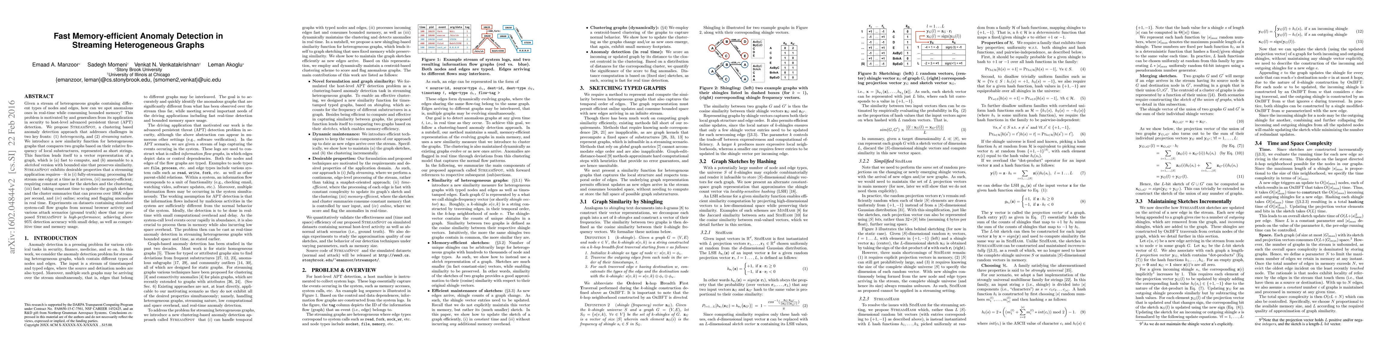 StreamSpot is a memory-efficient, real-time clustering-based anomaly detection method for streaming heterogeneous graphs, achieving over 95% detection accuracy while processing over 100K edges per second and maintaining constant memory usage. It introduces a novel similarity function based on local substructures to handle the graph's heterogeneity and streaming nature.