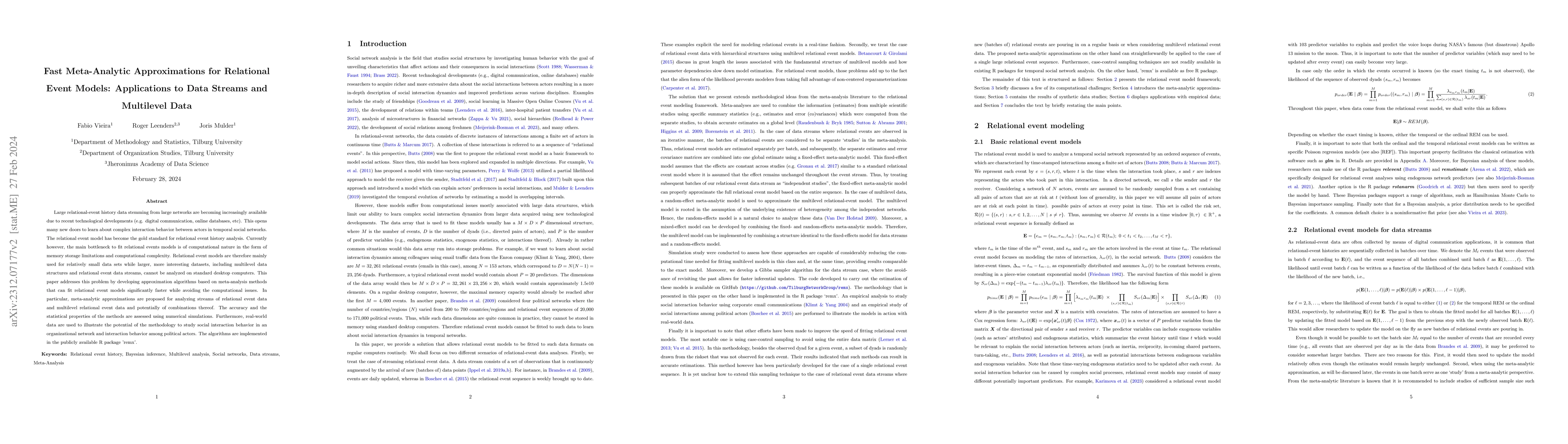 This paper develops fast meta-analytic approximation algorithms to fit relational event models for large, complex datasets, addressing computational challenges. The proposed methods enable analysis of data streams and multilevel data, demonstrated through simulations and real-world applications in social and political networks, and are implemented in the R package 'remx'.