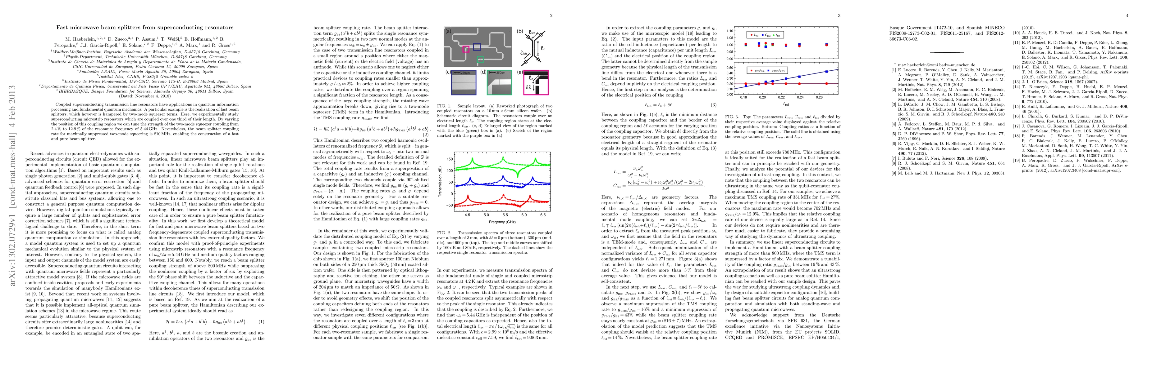 This paper presents an experimental study on fast microwave beam splitters using coupled superconducting microstrip resonators. The researchers successfully tune the two-mode squeezer coupling to achieve a beam splitter coupling rate of 810 MHz, enabling efficient quantum information processing.