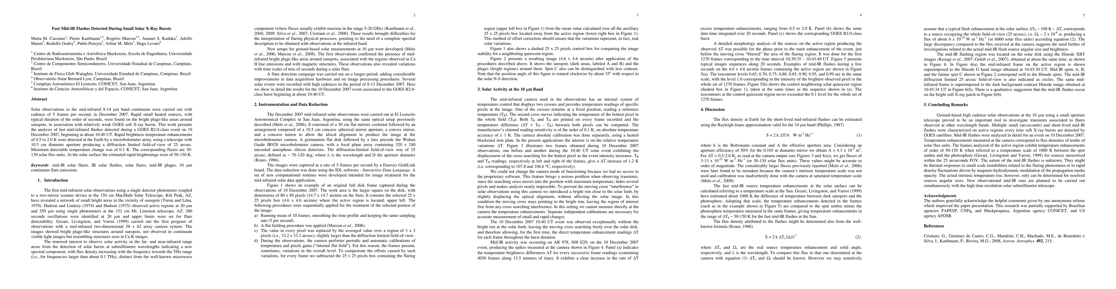 Solar observations in the mid-infrared 8-14 \mu\m band continuum were carried out with cadence of 5 frames per second, in December 2007. Rapid small heated sources, with typical duration of the order of seconds, were found on the bright plage-like areas around sunspots, in association with relatively weak GOES soft X-ray bursts. This work presents the analysis of fast mid-infrared flashes detected during a GOES B2.0-class event on 10 December 2007, beginning at about 10:40 UT. Rapid brightness temperature enhancements of 0.5 to 2.0 K were detected at the Earth by a microbolometer array, using a telescope with 10.5 cm diameter aperture producing a diffraction limited field-of-view of 25 arcsec. Minimum detectable temperature change was of 0.1 K. The corresponding fluxes are 30-130 solar flux units. At the solar surface the estimated rapid brightenings were of 50-150 K