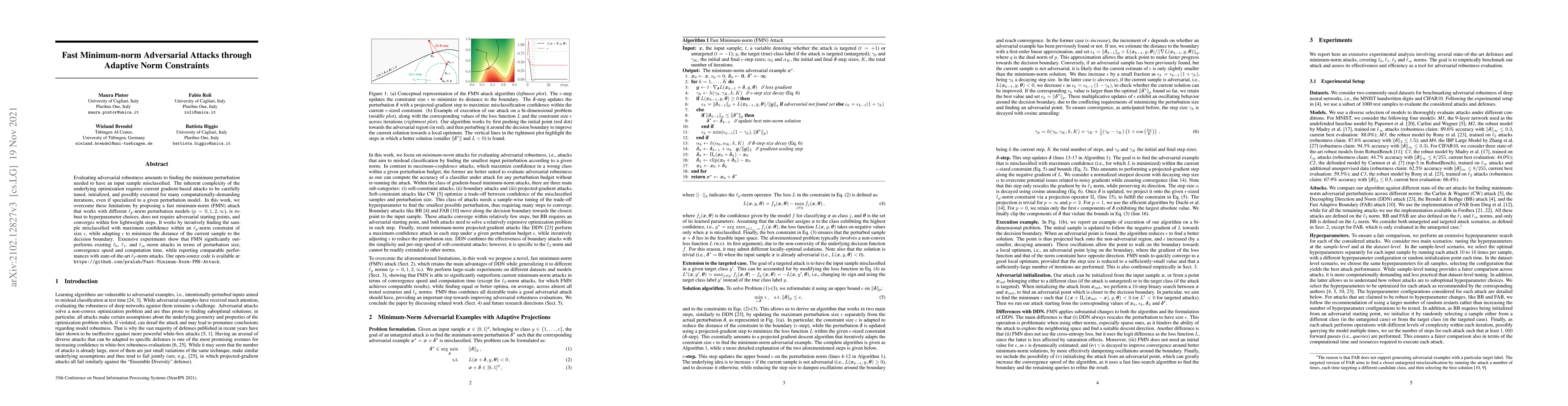 This paper proposes a fast minimum-norm (FMN) attack for generating adversarial examples that efficiently finds the smallest perturbation to misclassify input samples, working across various $\ell_p$-norm models and requiring few iterations. FMN outperforms existing attacks in speed and computation while maintaining or reducing perturbation size.