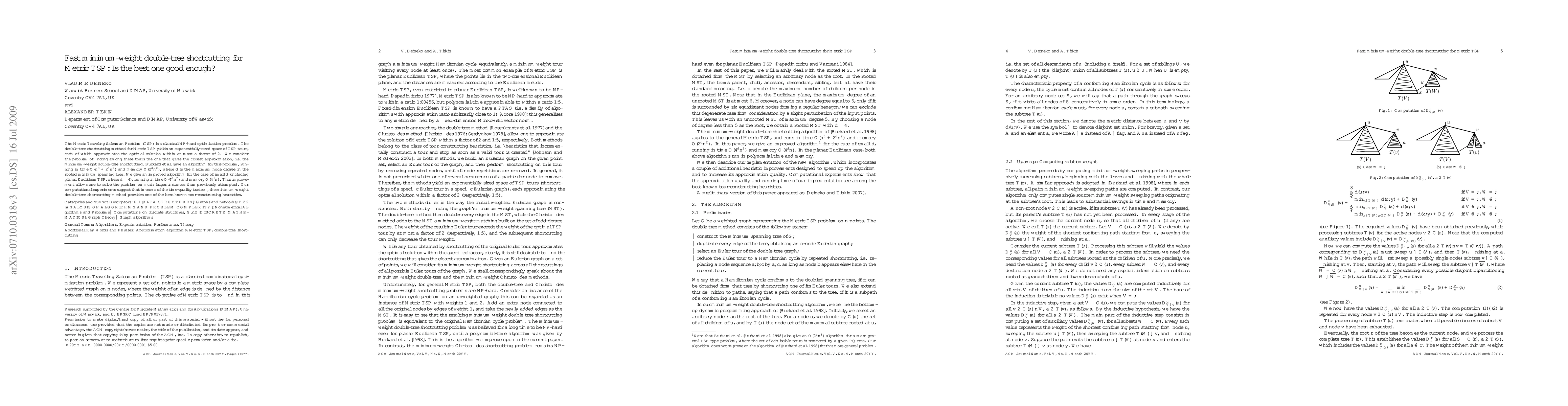 The Metric Traveling Salesman Problem (TSP) is a classical NP-hard optimization problem. The double-tree shortcutting method for Metric TSP yields an exponentially-sized space of TSP tours, each of which approximates the optimal solution within at most a factor of 2. We consider the problem of finding among these tours the one that gives the closest approximation, i.e.\ the \emph{minimum-weight double-tree shortcutting}. Burkard et al. gave an algorithm for this problem, running in time $O(n^3+2^d n^2)$ and memory $O(2^d n^2)$, where $d$ is the maximum node degree in the rooted minimum spanning tree. We give an improved algorithm for the case of small $d$ (including planar Euclidean TSP, where $d \leq 4$), running in time $O(4^d n^2)$ and memory $O(4^d n)$. This improvement allows one to solve the problem on much larger instances than previously attempted. Our computational experiments suggest that in terms of the time-quality tradeoff, the minimum-weight double-tree shortcutting method provides one of the best known tour-constructing heuristics.