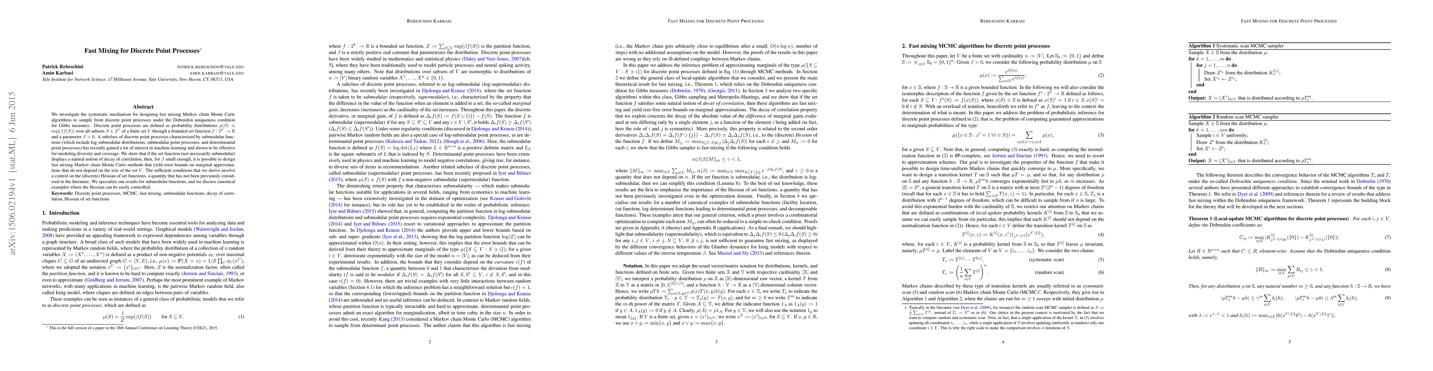 We investigate the systematic mechanism for designing fast mixing Markov chain Monte Carlo algorithms to sample from discrete point processes under the Dobrushin uniqueness condition for Gibbs measures. Discrete point processes are defined as probability distributions $\mu(S)\propto \exp(\beta f(S))$ over all subsets $S\in 2^V$ of a finite set $V$ through a bounded set function $f:2^V\rightarrow \mathbb{R}$ and a parameter $\beta>0$. A subclass of discrete point processes characterized by submodular functions (which include log-submodular distributions, submodular point processes, and determinantal point processes) has recently gained a lot of interest in machine learning and shown to be effective for modeling diversity and coverage. We show that if the set function (not necessarily submodular) displays a natural notion of decay of correlation, then, for $\beta$ small enough, it is possible to design fast mixing Markov chain Monte Carlo methods that yield error bounds on marginal approximations that do not depend on the size of the set $V$. The sufficient conditions that we derive involve a control on the (discrete) Hessian of set functions, a quantity that has not been previously considered in the literature. We specialize our results for submodular functions, and we discuss canonical examples where the Hessian can be easily controlled.