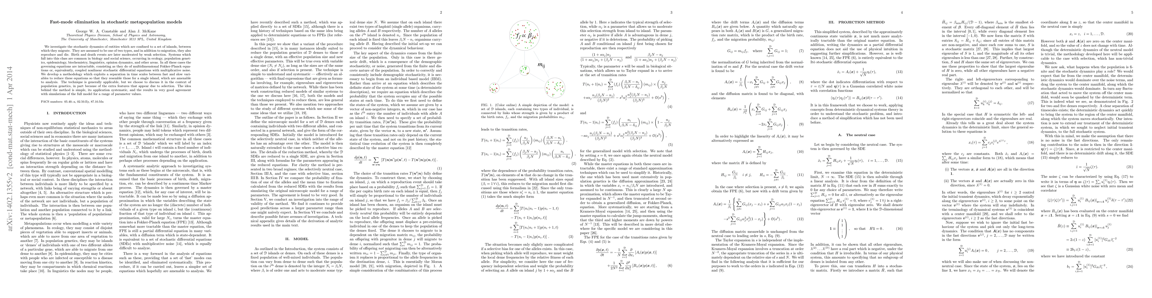 We investigate the stochastic dynamics of entities which are confined to a set of islands, between which they migrate. They are assumed to be one of two types, and in addition to migration, they also reproduce and die. Systems which fall into this class are common in biology and social science, occurring in ecology, population genetics, epidemiology, biochemistry, linguistics, opinion dynamics, and other areas. In all these cases the governing equations are intractable, consisting as they do of multidimensional Fokker-Planck equations or, equivalently, coupled nonlinear stochastic differential equations with multiplicative noise. We develop a methodology which exploits a separation in time scales between fast and slow variables to reduce these equations so that they resemble those for a single island, which are amenable to analysis. The technique is generally applicable, but we choose to discuss it in the context of population genetics, in part because of the extra features that appear due to selection. The idea behind the method is simple, its application systematic, and the results in very good agreement with simulations of the full model for a range of parameter values.
