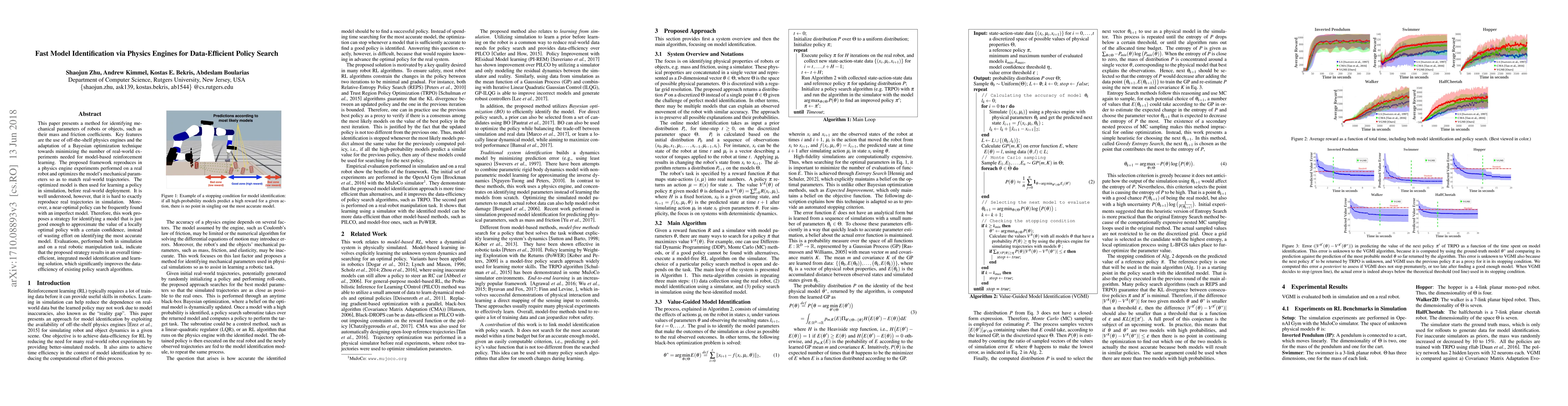 This paper presents a method for identifying mechanical parameters of robots or objects, such as their mass and friction coefficients. Key features are the use of off-the-shelf physics engines and the adaptation of a Bayesian optimization technique towards minimizing the number of real-world experiments needed for model-based reinforcement learning. The proposed framework reproduces in a physics engine experiments performed on a real robot and optimizes the model's mechanical parameters so as to match real-world trajectories. The optimized model is then used for learning a policy in simulation, before real-world deployment. It is well understood, however, that it is hard to exactly reproduce real trajectories in simulation. Moreover, a near-optimal policy can be frequently found with an imperfect model. Therefore, this work proposes a strategy for identifying a model that is just good enough to approximate the value of a locally optimal policy with a certain confidence, instead of wasting effort on identifying the most accurate model. Evaluations, performed both in simulation and on a real robotic manipulation task, indicate that the proposed strategy results in an overall time-efficient, integrated model identification and learning solution, which significantly improves the data-efficiency of existing policy search algorithms.