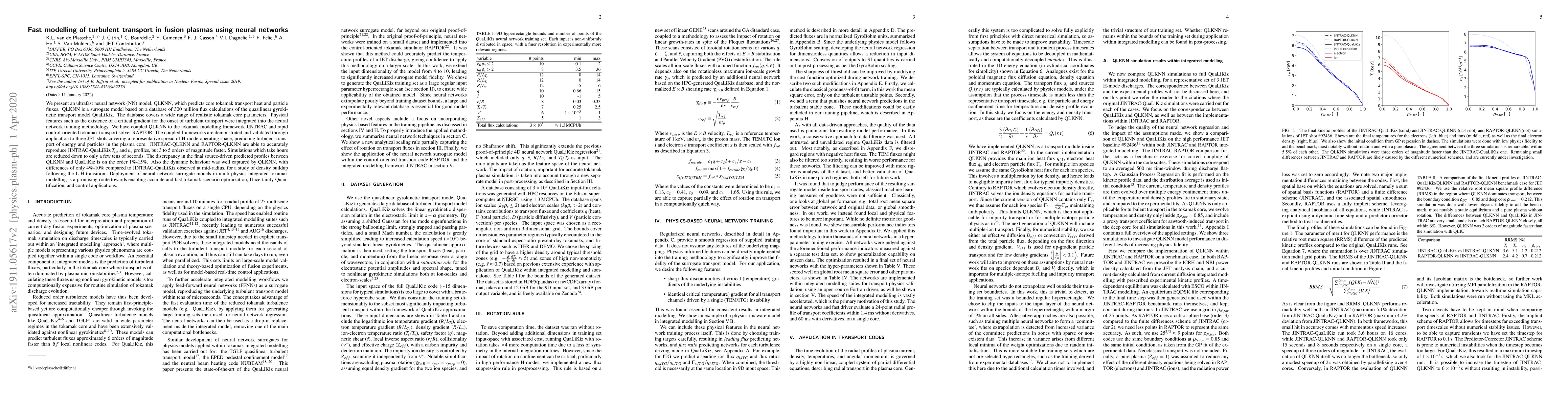 This paper introduces a fast neural network model, QLKNN, that accurately predicts turbulent transport heat and particle fluxes in fusion plasmas, achieving speeds 3 to 5 orders of magnitude faster than traditional methods. The model is trained on a large dataset from the quasilinear gyrokinetic transport model and is integrated into the JINTRAC and RAPTOR frameworks, demonstrating its effectiveness in predicting plasma profiles and dynamic behavior with minimal error.