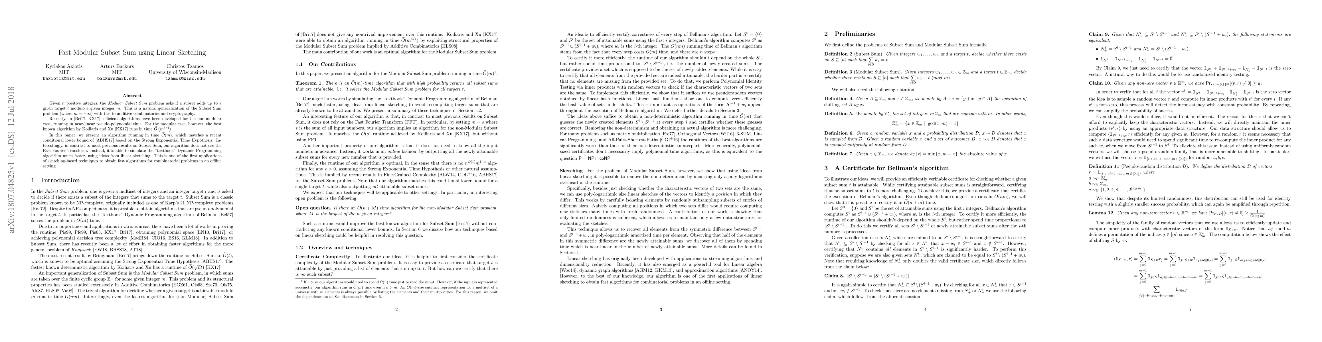 This paper presents an efficient algorithm for the Modular Subset Sum problem, achieving a runtime of O~(m) and matching a conditional lower bound, using linear sketching instead of Fast Fourier Transform. This marks a significant advancement over previous methods and applies sketching techniques to combinatorial problems in an offline setting.