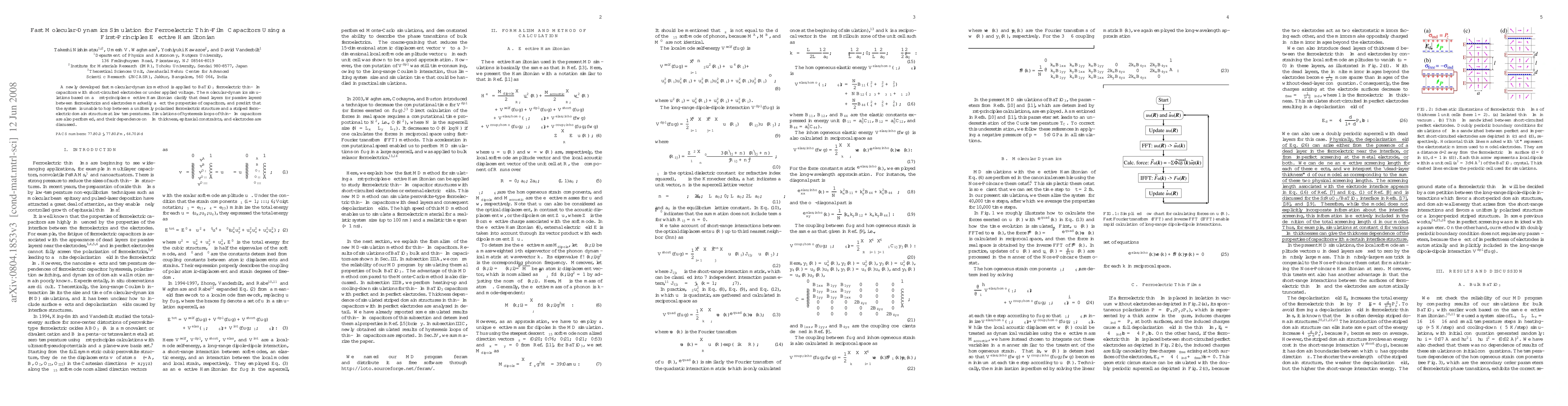 This paper introduces a fast molecular-dynamics simulation method for BaTiO3 ferroelectric thin-film capacitors using a first-principles effective Hamiltonian. It reveals that dead layers between ferroelectrics and electrodes significantly impact capacitor properties, and predicts low-temperature transitions between polarized structures.