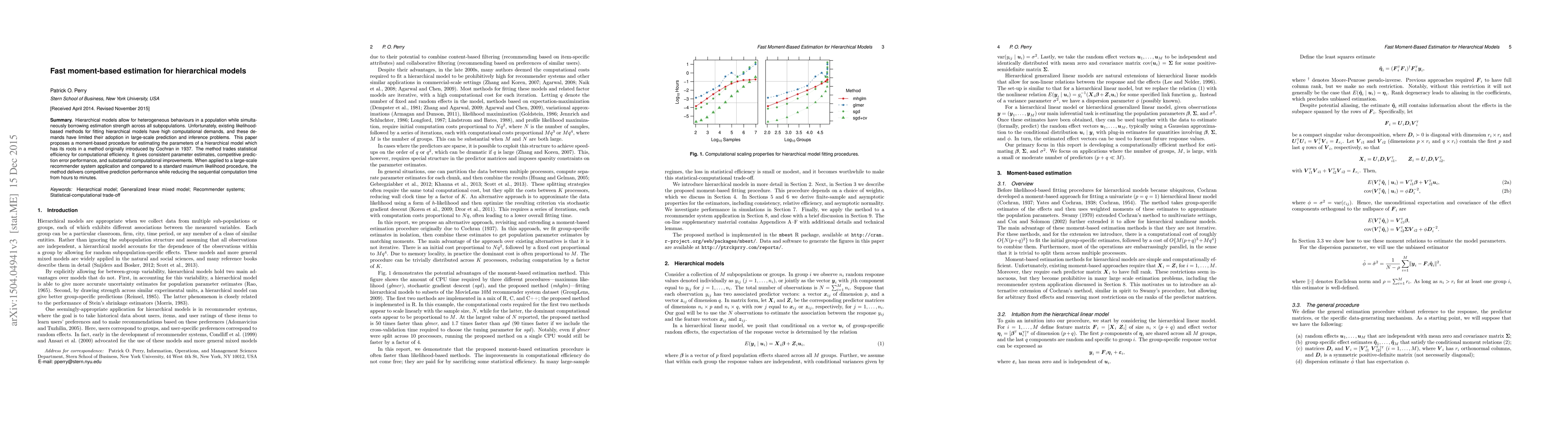 This paper introduces a moment-based estimation method for hierarchical models that significantly reduces computational time compared to traditional likelihood-based methods, maintaining consistent parameter estimates and competitive prediction performance, as demonstrated in a large-scale recommender system application.