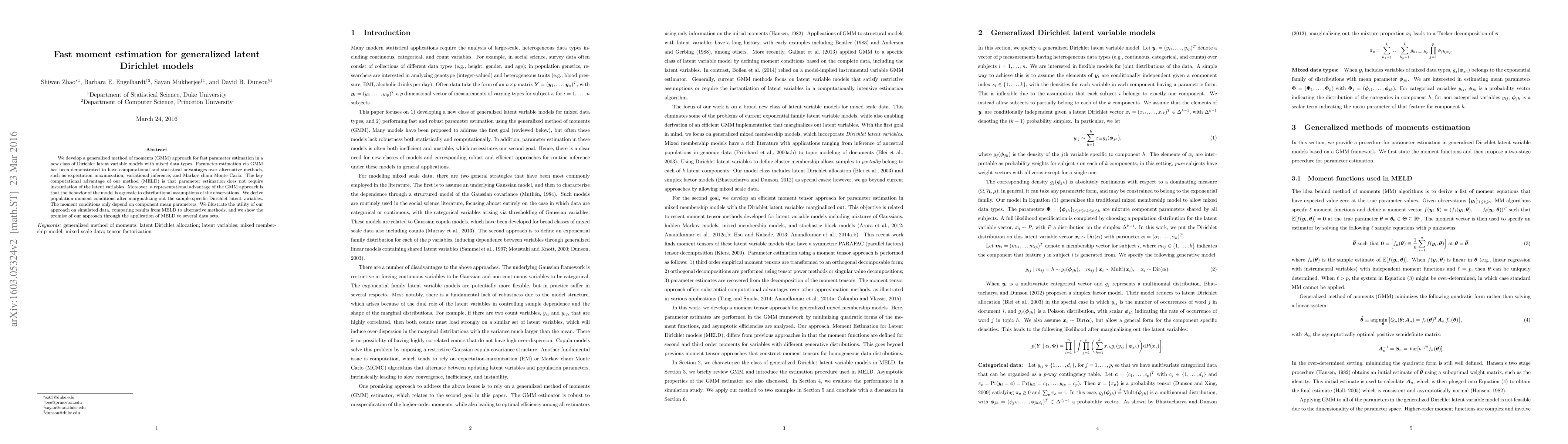 We develop a generalized method of moments (GMM) approach for fast parameter estimation in a new class of Dirichlet latent variable models with mixed data types. Parameter estimation via GMM has been demonstrated to have computational and statistical advantages over alternative methods, such as expectation maximization, variational inference, and Markov chain Monte Carlo. The key computational advan- tage of our method (MELD) is that parameter estimation does not require instantiation of the latent variables. Moreover, a representational advantage of the GMM approach is that the behavior of the model is agnostic to distributional assumptions of the observations. We derive population moment conditions after marginalizing out the sample-specific Dirichlet latent variables. The moment conditions only depend on component mean parameters. We illustrate the utility of our approach on simulated data, comparing results from MELD to alternative methods, and we show the promise of our approach through the application of MELD to several data sets.