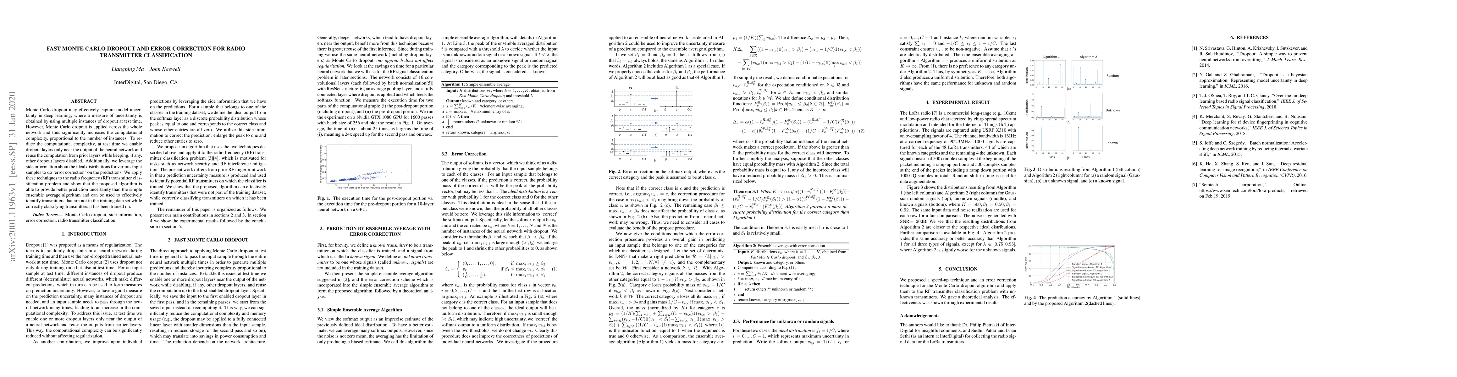 This paper proposes a fast Monte Carlo dropout method that reduces computational complexity by enabling dropout only near the output layer of neural networks. It also uses error correction techniques based on side information to improve prediction accuracy, demonstrating superior performance in radio frequency transmitter classification compared to ensemble averaging.