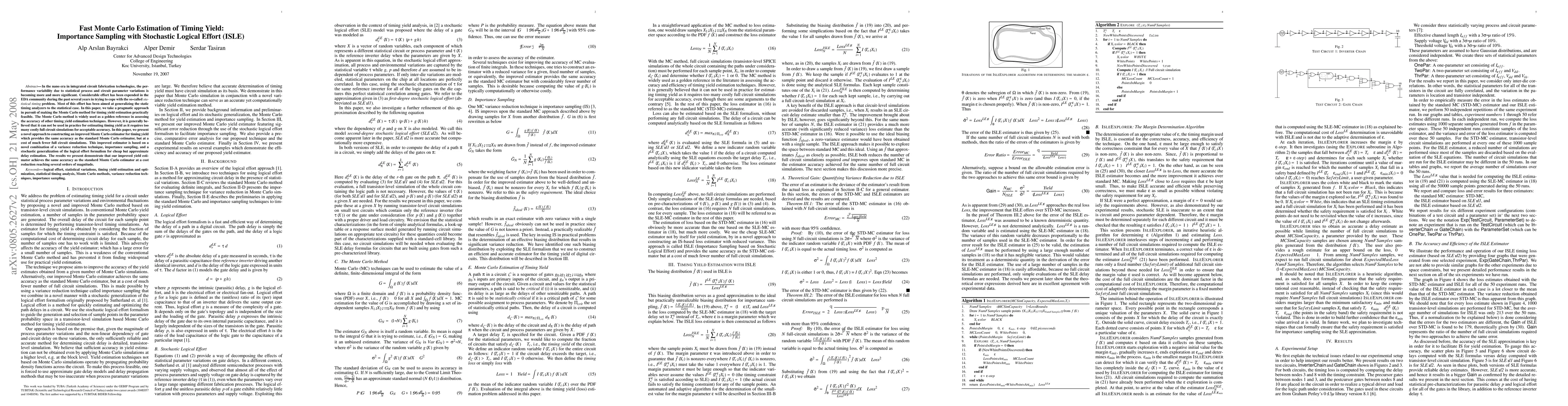 In the nano era in integrated circuit fabrication technologies, the performance variability due to statistical process and circuit parameter variations is becoming more and more significant. Considerable effort has been expended in the EDA community during the past several years in trying to cope with the so-called statistical timing problem. Most of this effort has been aimed at generalizing the static timing analyzers to the statistical case. In this paper, we take a pragmatic approach in pursuit of making the Monte Carlo method for timing yield estimation practically feasible. The Monte Carlo method is widely used as a golden reference in assessing the accuracy of other timing yield estimation techniques. However, it is generally believed that it can not be used in practice for estimating timing yield as it requires too many costly full circuit simulations for acceptable accuracy. In this paper, we present a novel approach to constructing an improvedMonte Carlo estimator for timing yield which provides the same accuracy as the standard Monte Carlo estimator, but at a cost of much fewer full circuit simulations. This improved estimator is based on a novel combination of a variance reduction technique, importance sampling, and a stochastic generalization of the logical effort formalism for cheap but approximate delay estimation. The results we present demonstrate that our improved yield estimator achieves the same accuracy as the standard Monte Carlo estimator at a cost reduction reaching several orders of magnitude.