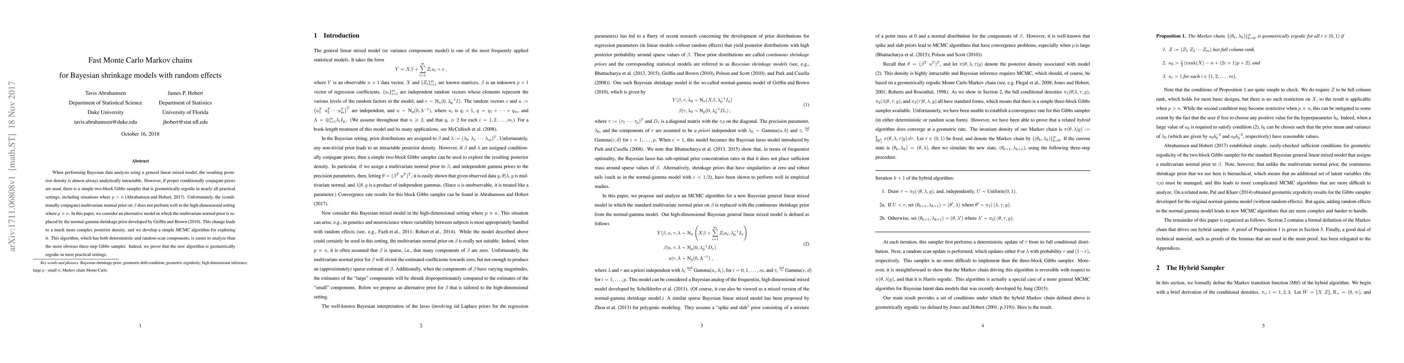 When performing Bayesian data analysis using a general linear mixed model, the resulting posterior density is almost always analytically intractable. However, if proper conditionally conjugate priors are used, there is a simple two-block Gibbs sampler that is geometrically ergodic in nearly all practical settings, including situations where $p > n$ (Abrahamsen and Hobert, 2017). Unfortunately, the (conditionally conjugate) multivariate normal prior on $\beta$ does not perform well in the high-dimensional setting where $p \gg n$. In this paper, we consider an alternative model in which the multivariate normal prior is replaced by the normal-gamma shrinkage prior developed by Griffin and Brown (2010). This change leads to a much more complex posterior density, and we develop a simple MCMC algorithm for exploring it. This algorithm, which has both deterministic and random scan components, is easier to analyze than the more obvious three-step Gibbs sampler. Indeed, we prove that the new algorithm is geometrically ergodic in most practical settings.