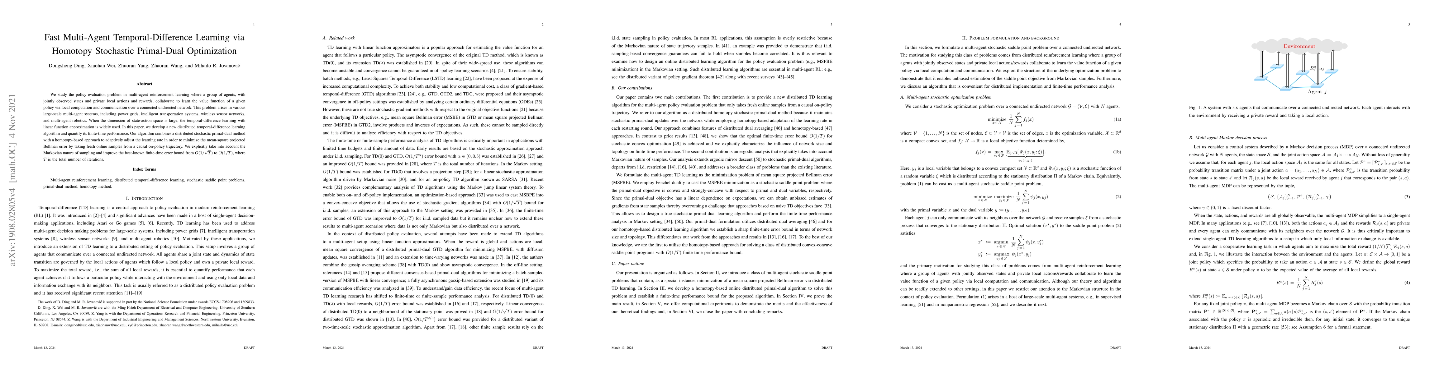 This paper proposes a new distributed temporal-difference learning algorithm for multi-agent systems that combines stochastic primal-dual optimization with a homotopy-based approach to adaptively adjust the learning rate, improving the finite-time error bound from $O(1/\sqrt{T})$ to $O(1/T)$. The method is applicable to large-scale systems like power grids and intelligent transportation.