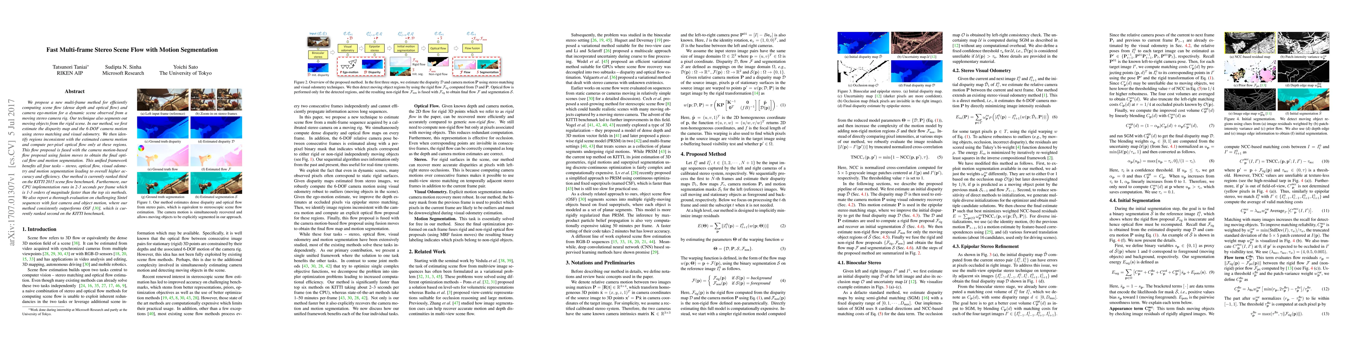 This paper introduces a fast multi-frame method for computing scene flow, camera ego-motion, and motion segmentation for dynamic scenes captured by a moving stereo camera. It estimates disparity and camera motion, then computes optical flow only in regions inconsistent with camera motion, leading to higher accuracy and efficiency.
