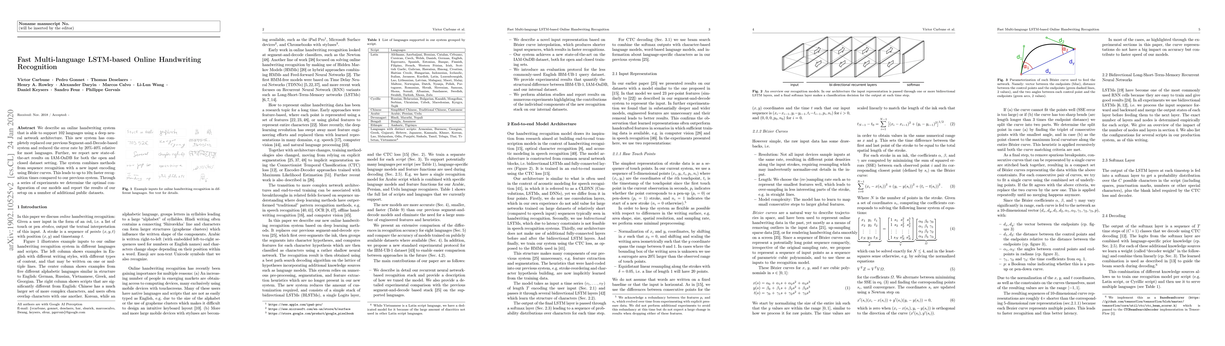 This paper presents a fast multi-language LSTM-based online handwriting recognition system that supports 102 languages, significantly reducing error rates by 20%-40% and achieving state-of-the-art results on the IAM-OnDB dataset. The new system employs sequence recognition methods and Bézier curve encoding for up to 10x faster recognition times compared to previous segment-and-decode-based systems.