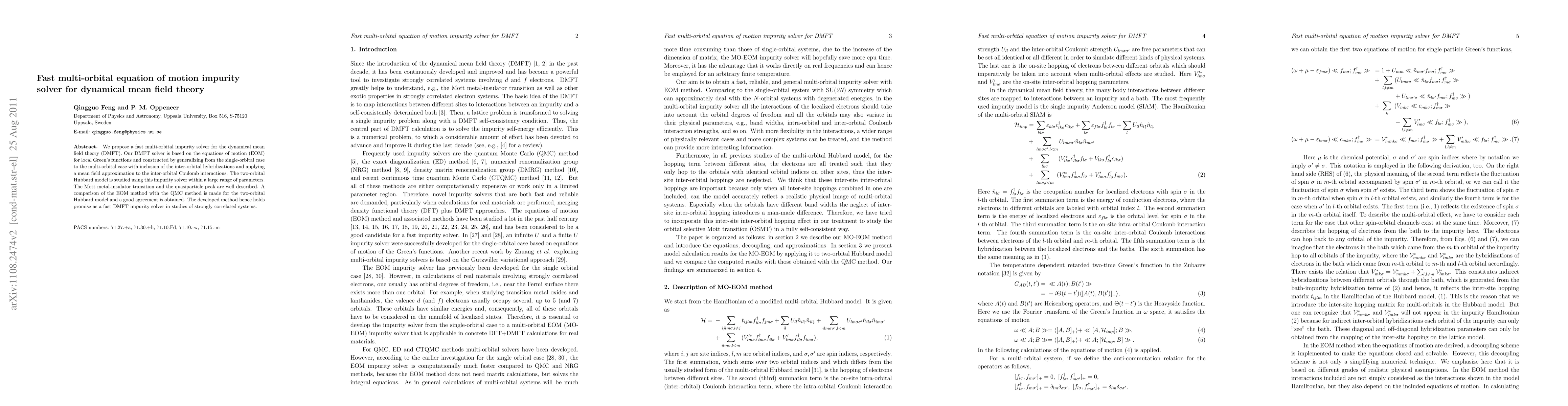 This research introduces a fast multi-orbital impurity solver for dynamical mean field theory (DMFT) based on equations of motion for local Green's functions, capable of describing inter-orbital hybridizations and interactions. The two-orbital Hubbard model's Mott transition and quasiparticle peaks are accurately captured, showing good agreement with quantum Monte Carlo methods, thus presenting a promising new approach for studying strongly correlated systems.
