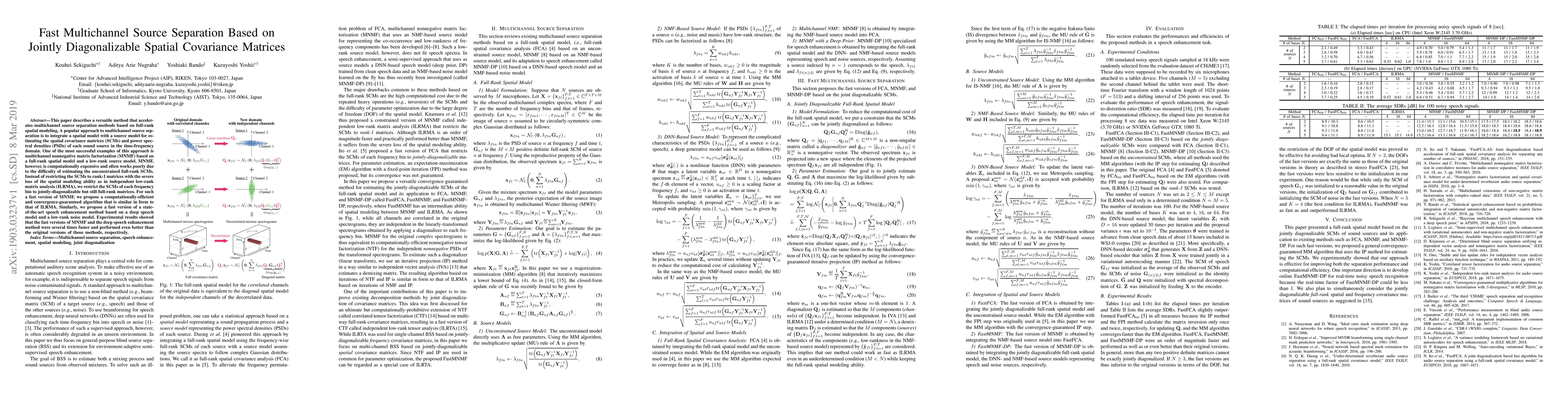 This paper describes a versatile method that accelerates multichannel source separation methods based on full-rank spatial modeling. A popular approach to multichannel source separation is to integrate a spatial model with a source model for estimating the spatial covariance matrices (SCMs) and power spectral densities (PSDs) of each sound source in the time-frequency domain. One of the most successful examples of this approach is multichannel nonnegative matrix factorization (MNMF) based on a full-rank spatial model and a low-rank source model. MNMF, however, is computationally expensive and often works poorly due to the difficulty of estimating the unconstrained full-rank SCMs. Instead of restricting the SCMs to rank-1 matrices with the severe loss of the spatial modeling ability as in independent low-rank matrix analysis (ILRMA), we restrict the SCMs of each frequency bin to jointly-diagonalizable but still full-rank matrices. For such a fast version of MNMF, we propose a computationally-efficient and convergence-guaranteed algorithm that is similar in form to that of ILRMA. Similarly, we propose a fast version of a state-of-the-art speech enhancement method based on a deep speech model and a low-rank noise model. Experimental results showed that the fast versions of MNMF and the deep speech enhancement method were several times faster and performed even better than the original versions of those methods, respectively.