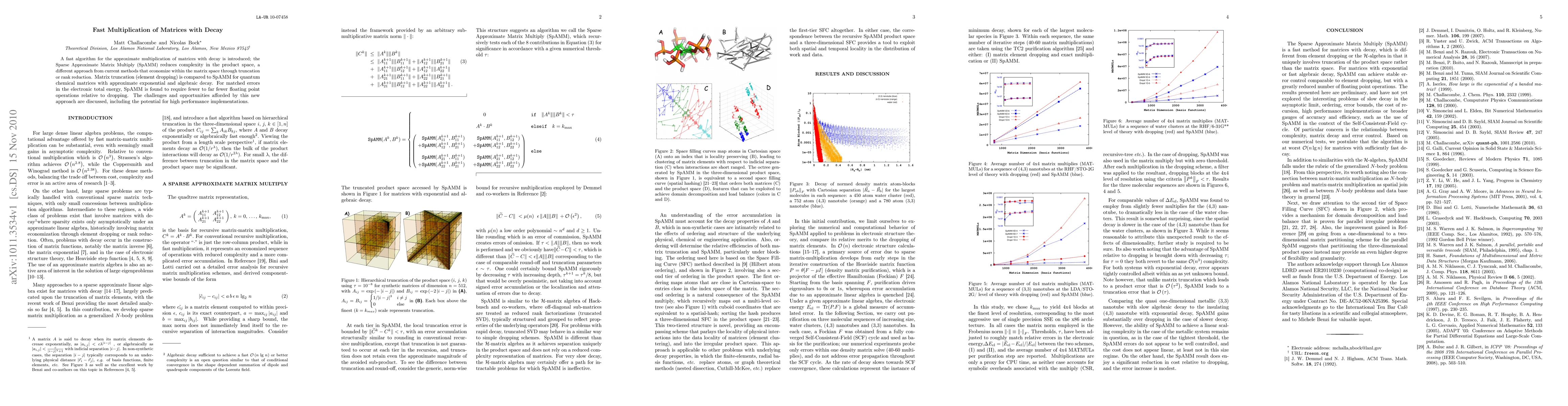The paper introduces the Sparse Approximate Matrix Multiply (SpAMM) algorithm for faster approximate multiplication of matrices with decay, contrasting it with matrix truncation methods. SpAMM requires significantly fewer floating point operations compared to truncation for quantum chemical matrices with decay, offering potential for high-performance implementations.