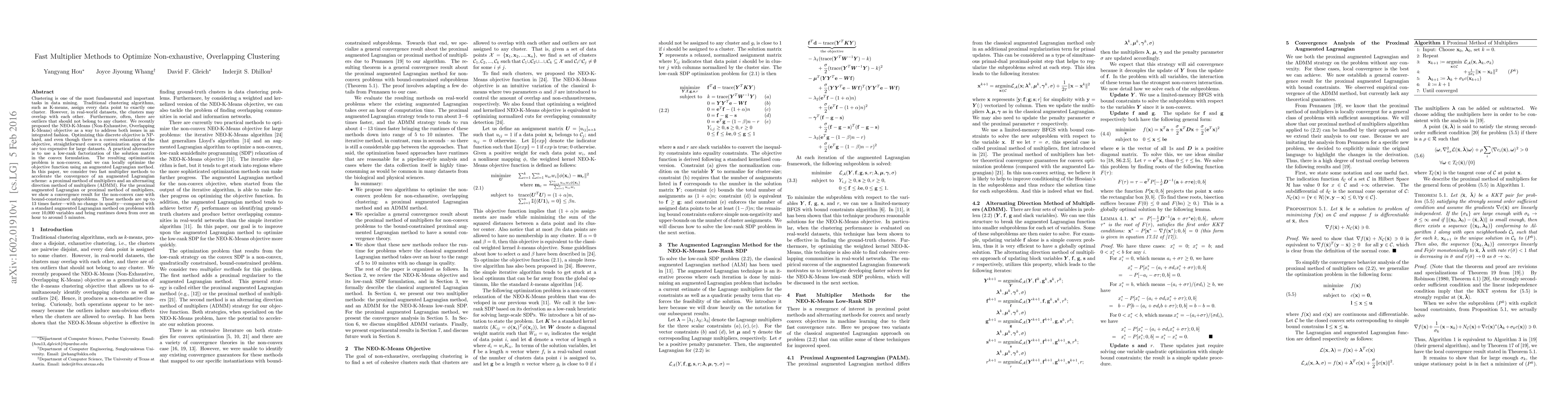This paper proposes fast multiplier methods, specifically a proximal method of multipliers and an alternating direction method of multipliers (ADMM), to accelerate the convergence of an augmented Lagrangian scheme for optimizing the NEO-K-Means objective, which addresses overlapping and non-exhaustive clustering. These methods achieve up to 13 times faster convergence compared to standard augmented Lagrangian methods, reducing runtimes from over an hour to around 5 minutes for large datasets.