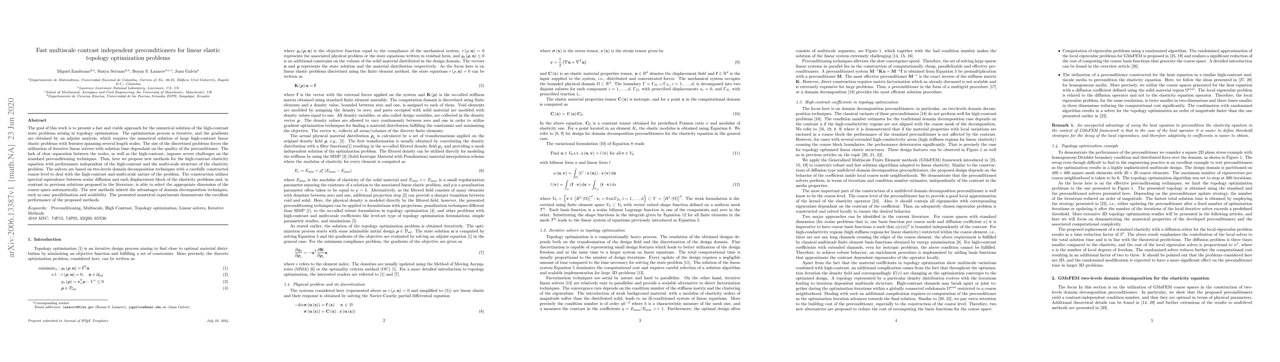 The goal of this work is to present a fast and viable approach for the numerical solution of the high-contrast state problems arising in topology optimization. The optimization process is iterative, and the gradients are obtained by an adjoint analysis, which requires the numerical solution of large high-contrast linear elastic problems with features spanning several length scales. The size of the discretized problems forces the utilization of iterative linear solvers with solution time dependant on the quality of the preconditioner. The lack of clear separation between the scales, as well as the high-contrast, imposes severe challenges on the standard preconditioning techniques. Thus, here we propose new methods for the high-contrast elasticity equation with performance independent of the high-contrast and the multi-scale structure of the elasticity problem. The solvers are based on two-levels domain decomposition techniques with a carefully constructed coarse level to deal with the high-contrast and multi-scale nature of the problem. The construction utilizes spectral equivalence between scalar diffusion and each displacement block of the elasticity problems and, in contrast to previous solutions proposed in the literature, is able to select the appropriate dimension of the coarse space automatically. The new methods inherit the advantages of domain decomposition techniques, such as easy parallelization and scalability. The presented numerical experiments demonstrate the excellent performance of the proposed methods.