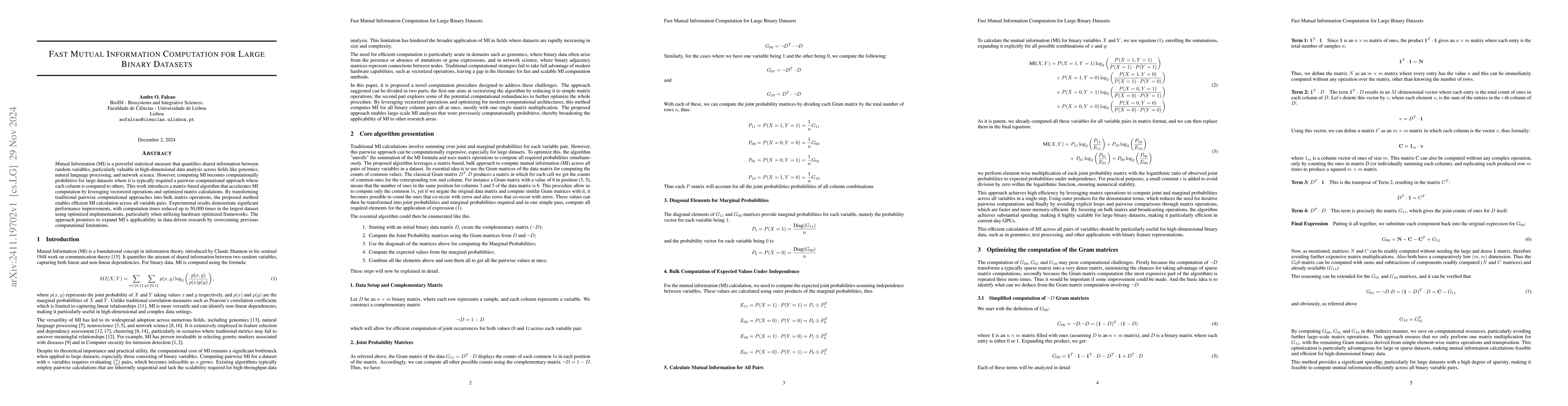 The paper presents a matrix-based algorithm for fast mutual information computation in large binary datasets, employing vectorized operations and optimized matrix calculations to significantly reduce computation time, achieving up to 50,000 times speedup in large datasets. This method enhances MI's applicability in high-dimensional data analysis fields.