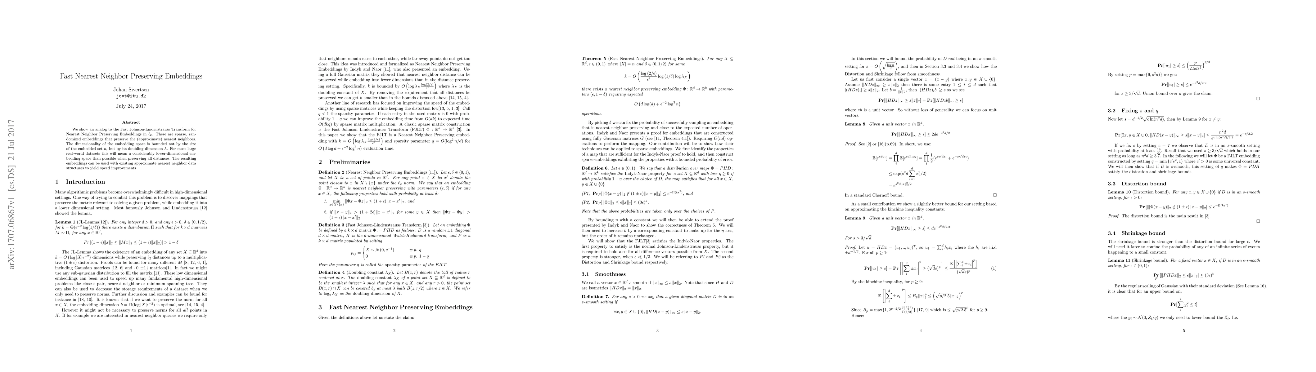 We show an analog to the Fast Johnson-Lindenstrauss Transform for Nearest Neighbor Preserving Embeddings in $\ell_2$. These are sparse, randomized embeddings that preserve the (approximate) nearest neighbors. The dimensionality of the embedding space is bounded not by the size of the embedded set n, but by its doubling dimension {\lambda}. For most large real-world datasets this will mean a considerably lower-dimensional embedding space than possible when preserving all distances. The resulting embeddings can be used with existing approximate nearest neighbor data structures to yield speed improvements.