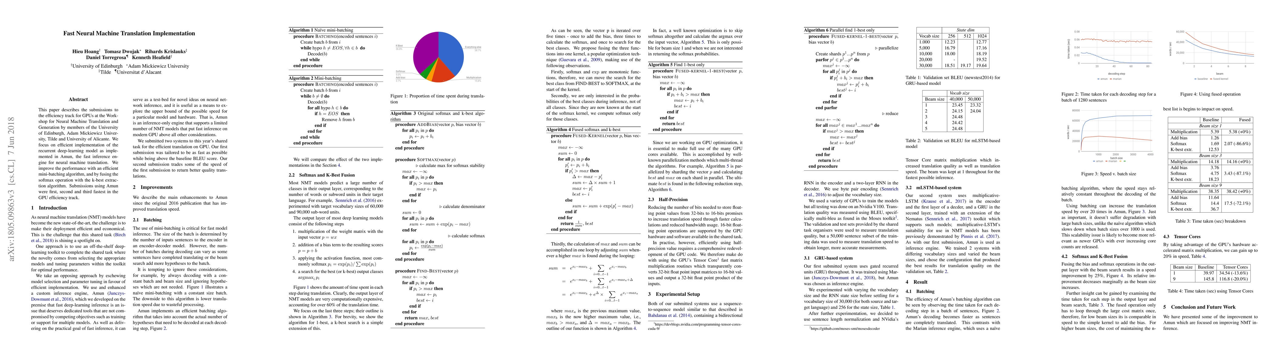This paper describes the submissions to the efficiency track for GPUs at the Workshop for Neural Machine Translation and Generation by members of the University of Edinburgh, Adam Mickiewicz University, Tilde and University of Alicante. We focus on efficient implementation of the recurrent deep-learning model as implemented in Amun, the fast inference engine for neural machine translation. We improve the performance with an efficient mini-batching algorithm, and by fusing the softmax operation with the k-best extraction algorithm. Submissions using Amun were first, second and third fastest in the GPU efficiency track.